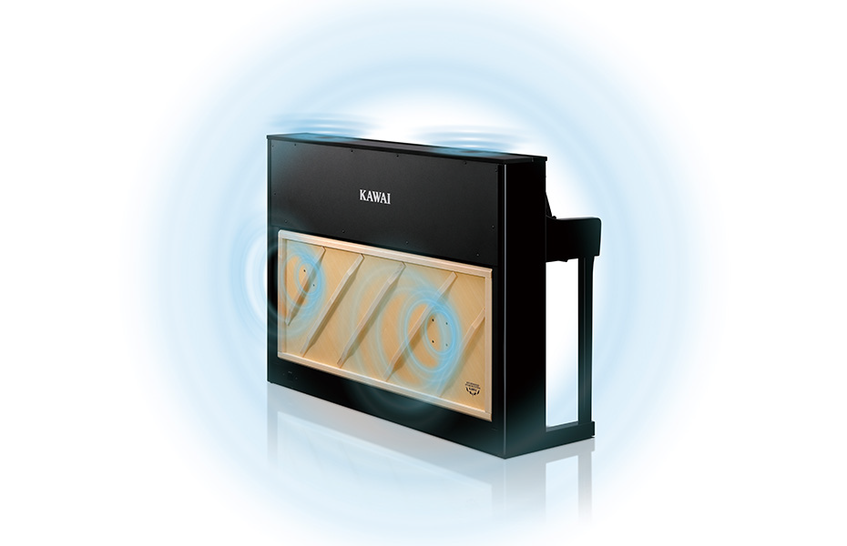 面積の広い響板に設置された、2種類の加振器が振動することで、スピーカーでは困難なグランドピアノの荘厳で伸びる低音や奥行き感のある響きを、振動そのものから忠実に再現。