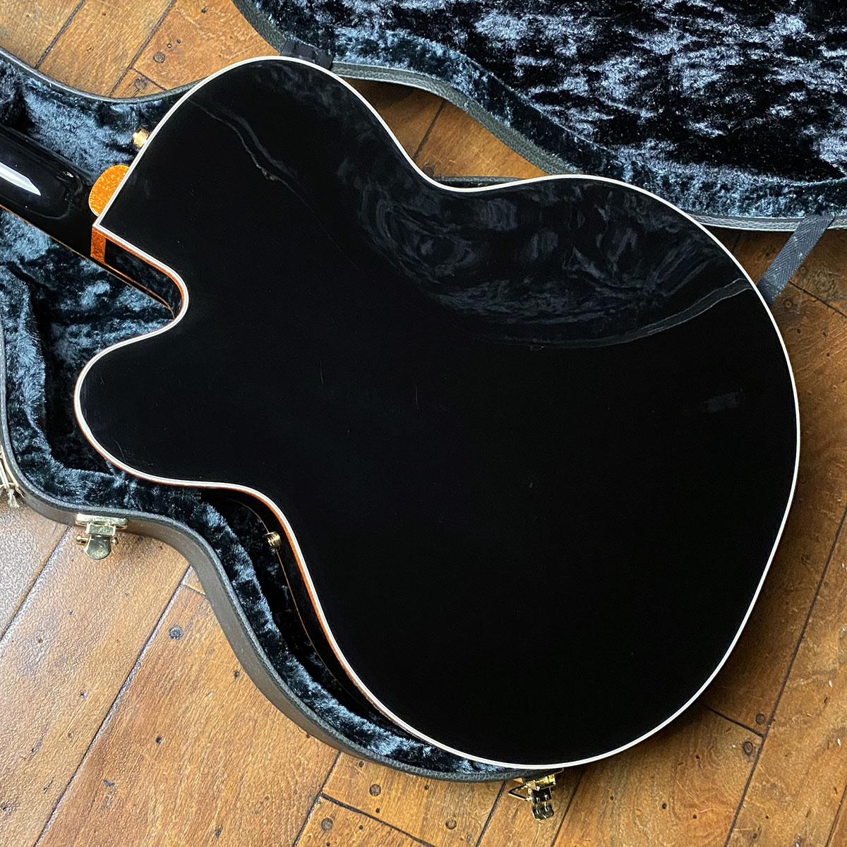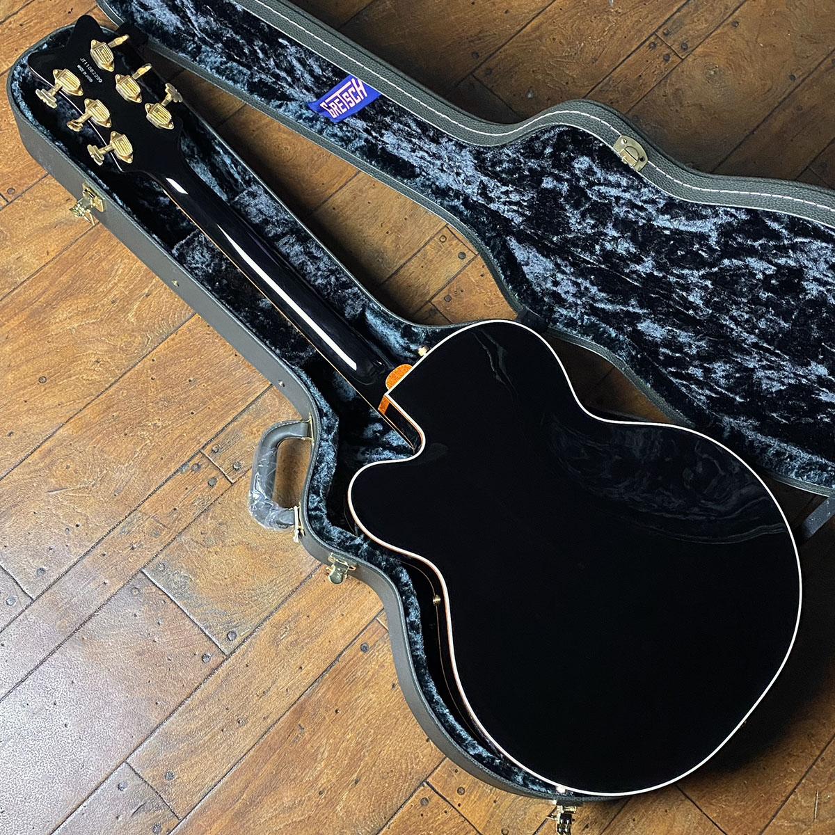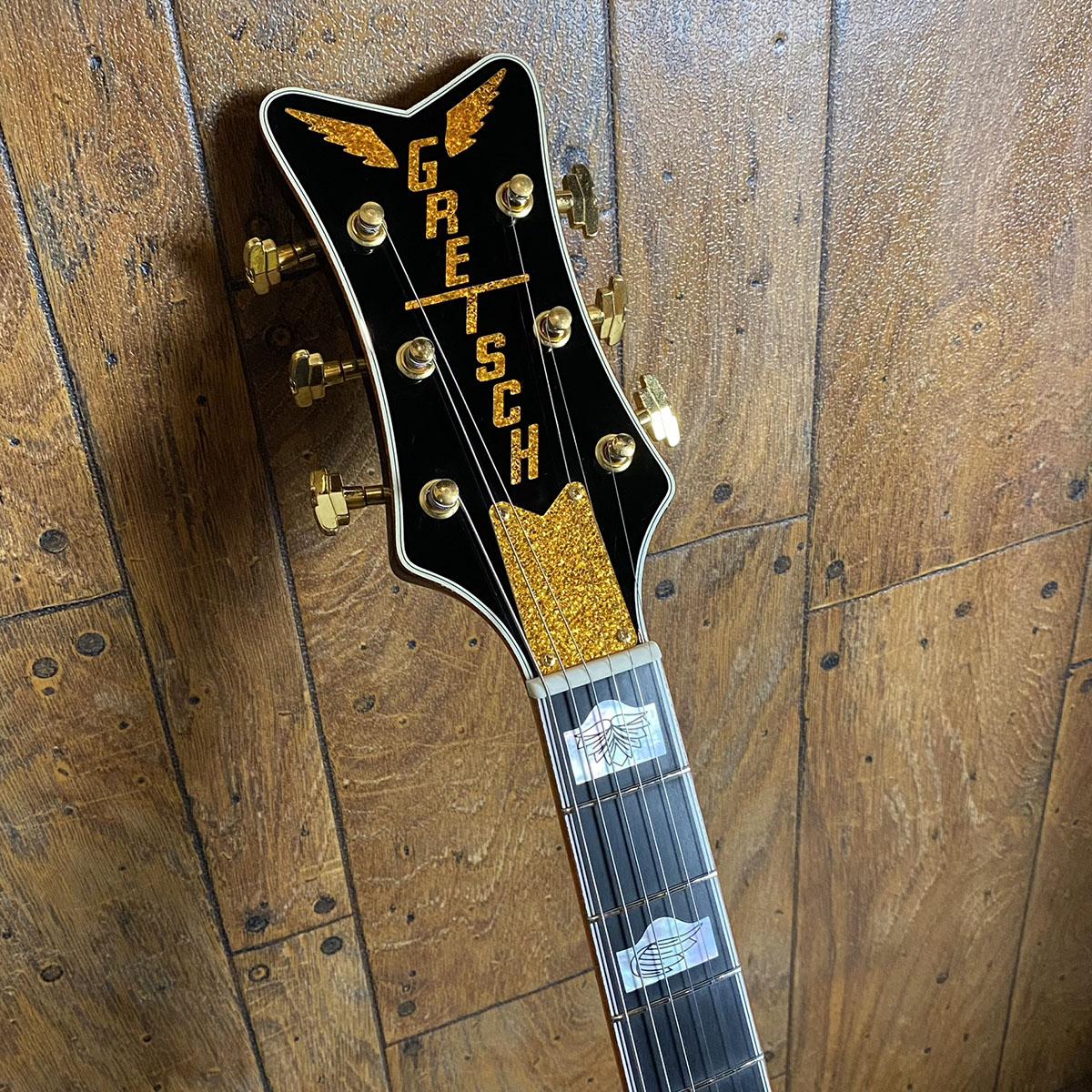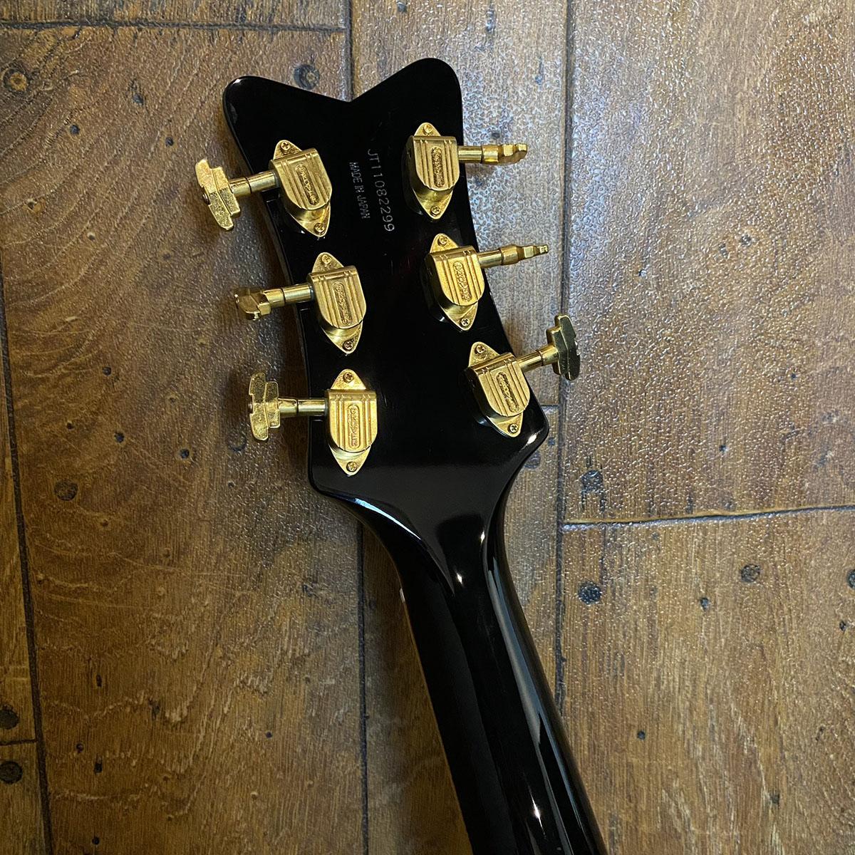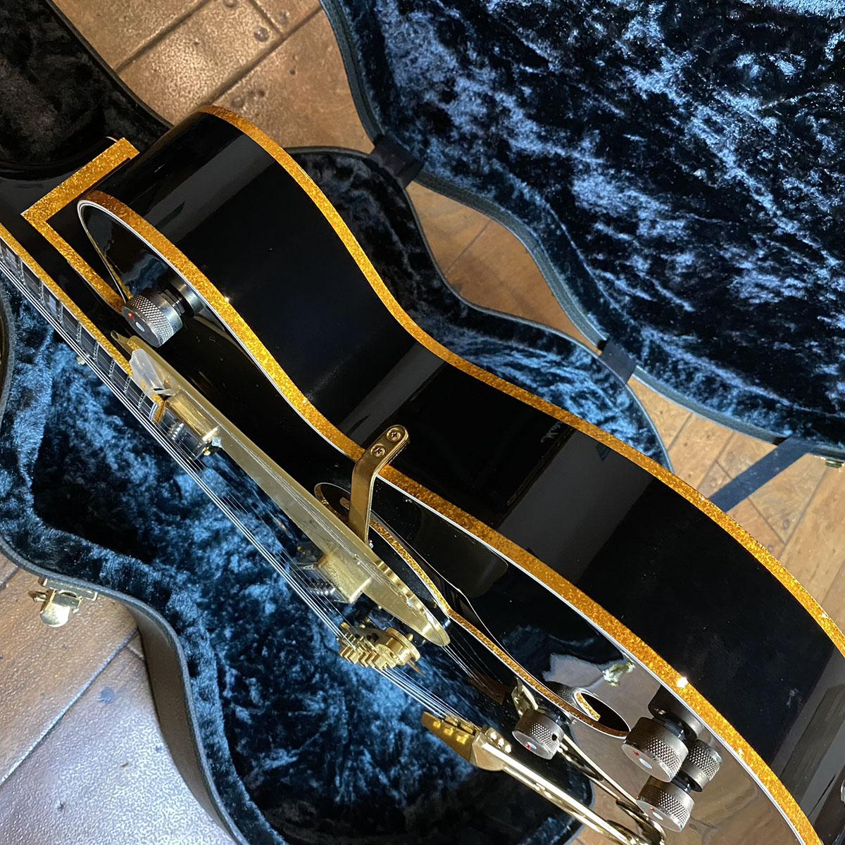シックなブラックカラーのボディにゴールとフレークのバインでィングを纏ったゴージャスなモデル。