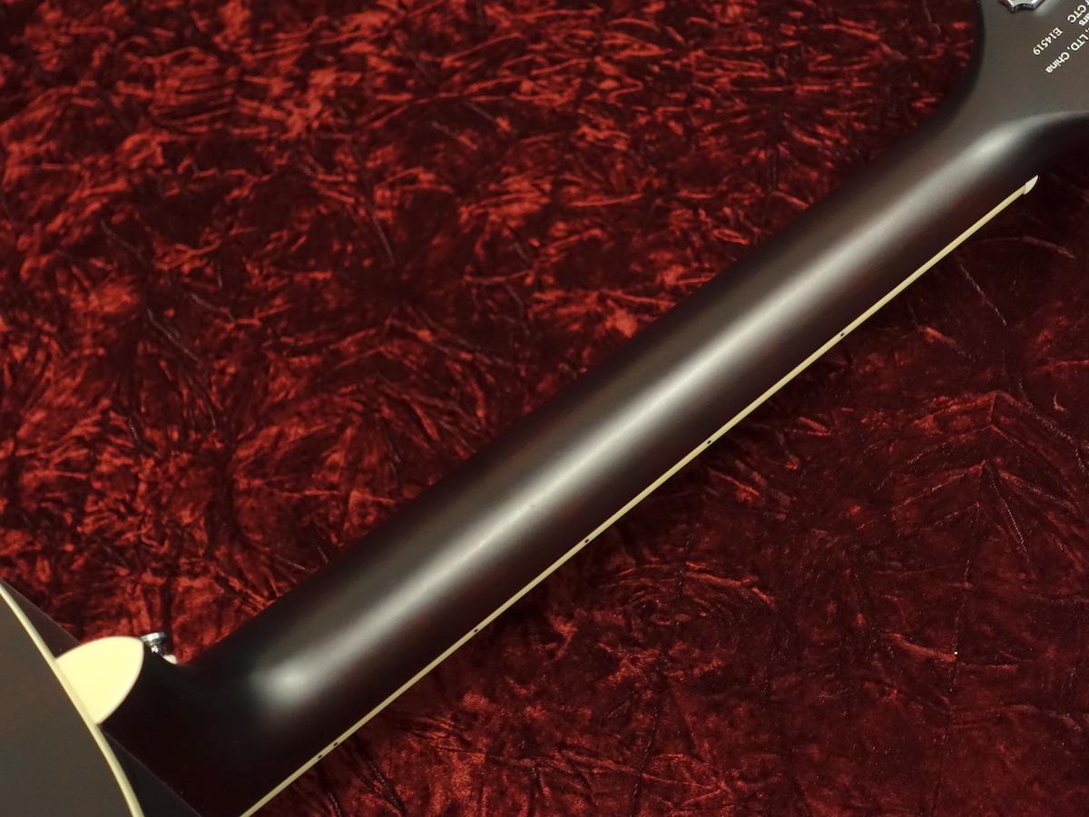 ソリッドマホガニートップ、マホガニーサイド&バックのボディにマホガニーネックをセットしたウッドマテリアル。クリームカラーのヘリンボーンバインディングとタバコサンバーストがマッチした渋い1本。小ぶりなサイズながらしっかりと生音を楽しめるモデルです。