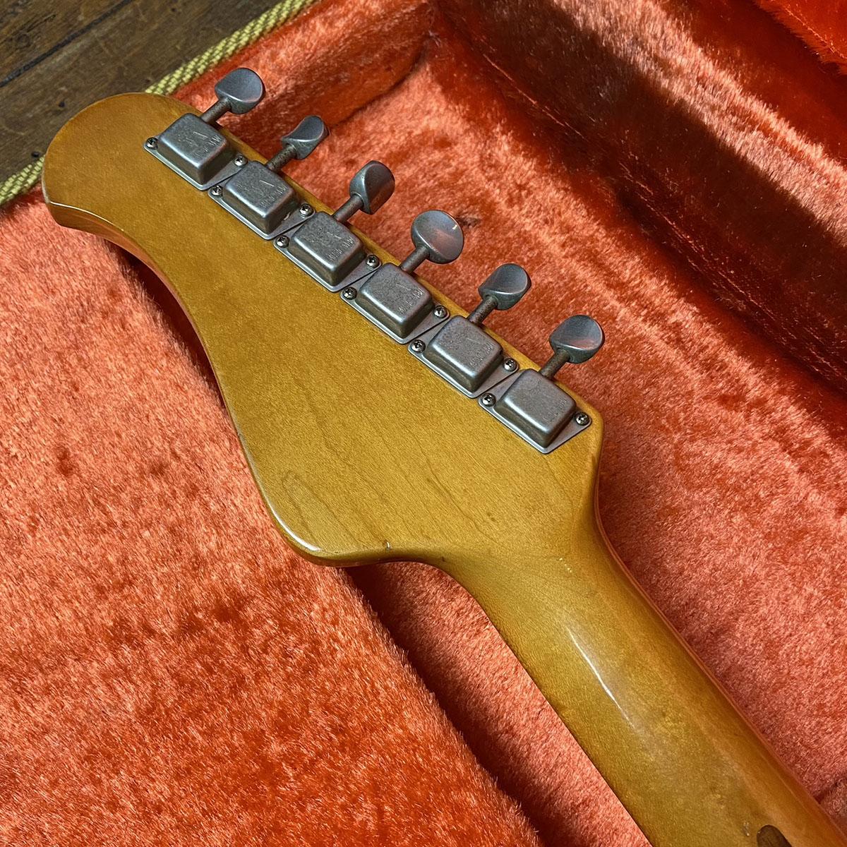 ヘッド側のトラスロッドアジャストや3点止めネックプレート等、当時のフェンダーギターに通づるスペックを持っていますね。