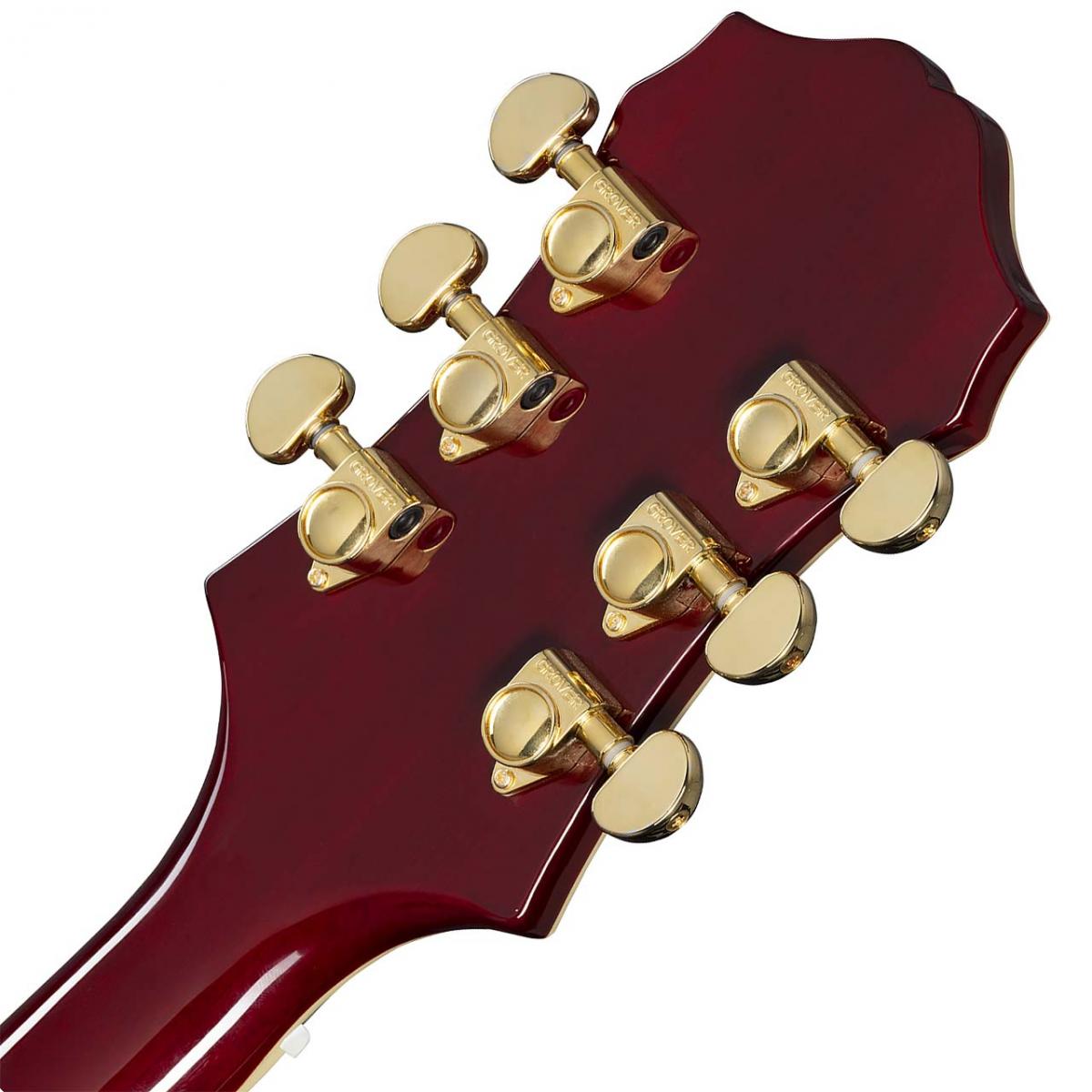 インディアンローレル指板上ではアバロン素材によるトライアングル・インレイとマザーオブパール素材によるブロック・インレイが施され、このジャンルレスに躍動するアーチトップモデルに落ち着いた気品をもたらしています。