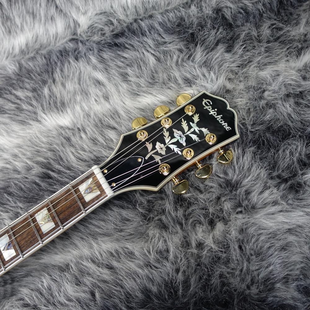 バインディング付きのヘッドストック上では、伝統的なエピフォンのロゴとマザーオブパールのツリーオブライフのデザインが施されています。