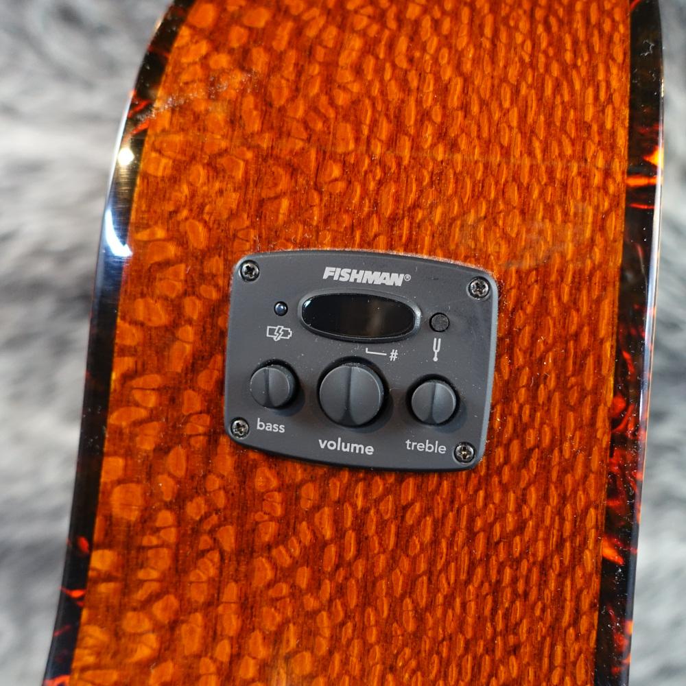 Fishmanのピックアップシステムを搭載したエレアコ仕様で、チューナー機能や2バンドEQなどを備えた使い勝手の良い一本です。