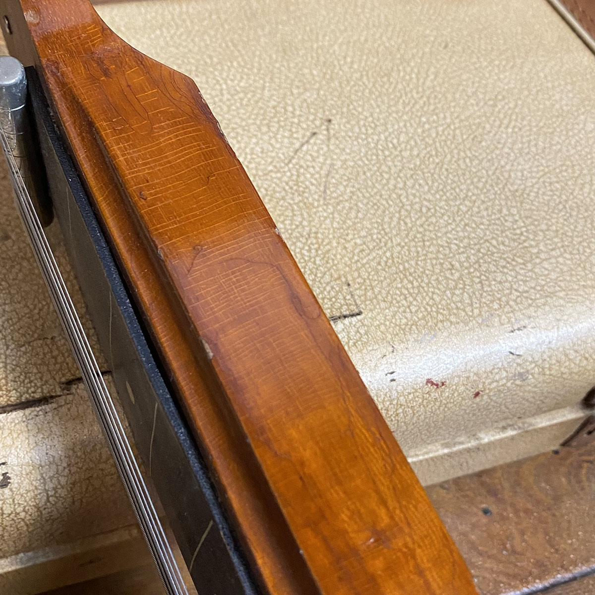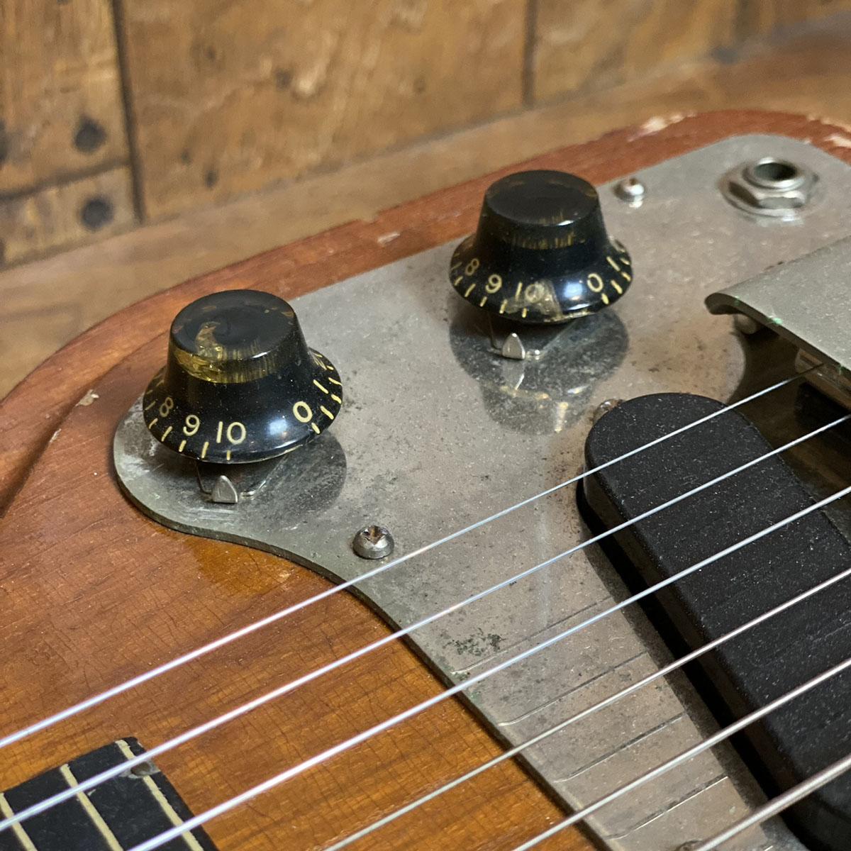 惜しいことにヘッドのレイズドロゴは欠損していますがピックアップ、ポット、ノブ、ペグ等主要パーツが残っている点は非常に嬉しいですね。