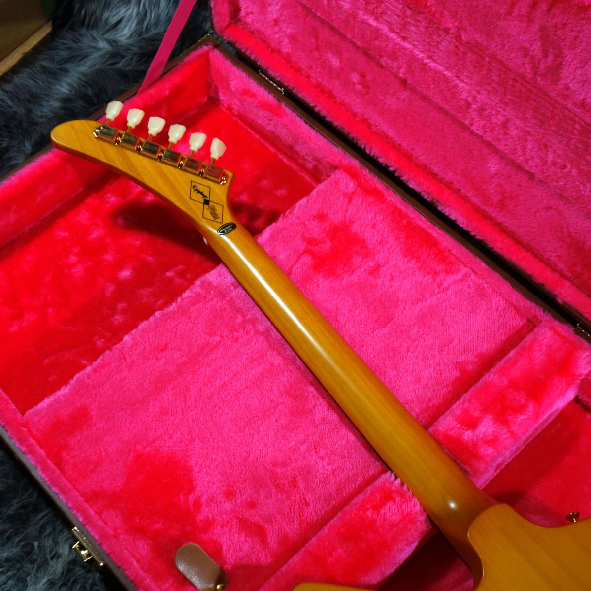 ヘッドストック裏にはEpiphone x Gibson Customロゴがあしらわれており、同様のロゴ入りハードシェルケースが付属されています。