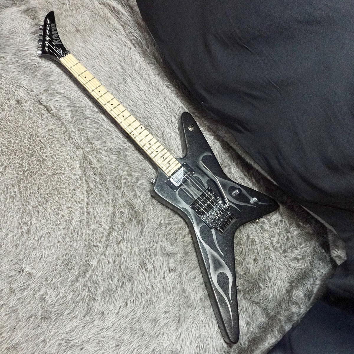 Gunstarの最大の魅力は、ブラックメタリックフィニッシュとフレイム・グラフィックの星型マホガニー“ボイジャー”ボディ、クラシック・クレイマー特有の尖ったヘッドストック(フロントにクレイマー・ピラミッド・ロゴ、バックにレンチホルダー付き)といった唯一無二のルックス!