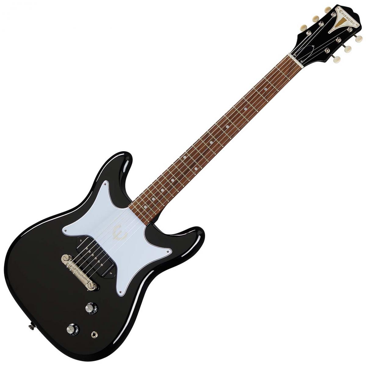 1基のPRO P-90ドッグイヤー・ピックアップを搭載した左右対称のダブルカッタウェイ・マホガニー・ボディ、カラマズー・ヘッドストック、ヘッドストック上に配されたエピフォン・ビキニバッジとアイボリー色のつまみを持つチューニングマシン、そしてホイル素材のEロゴが貼られたホワイト・バタフライ・ピックガードなど、充実した仕様が満載です。