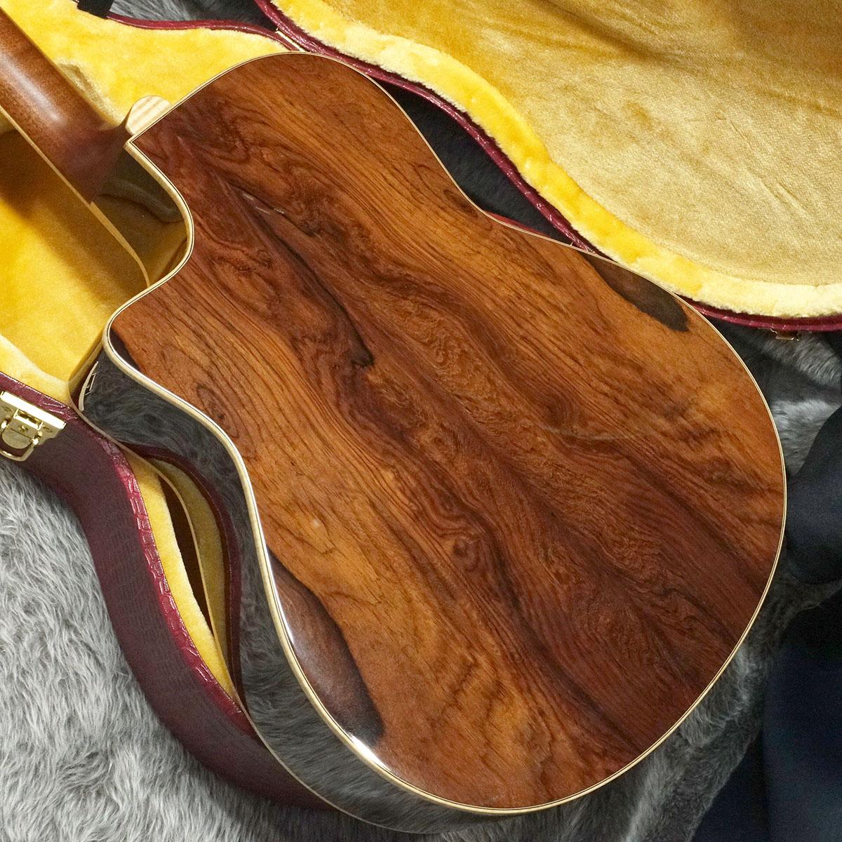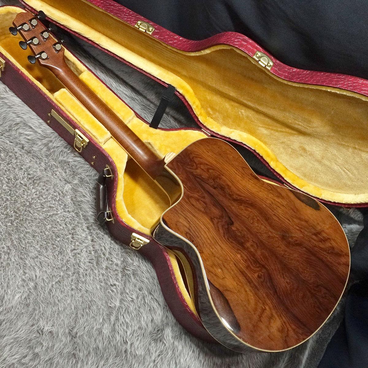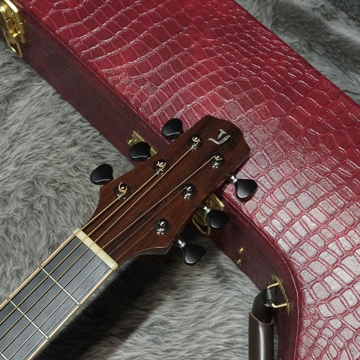 バインディングに「フレイムマホガニー」をチョイスし、装飾の随所にマダガスカルローズウッドや、アバロンを用い高級感漂うルックスに仕上がった一本。