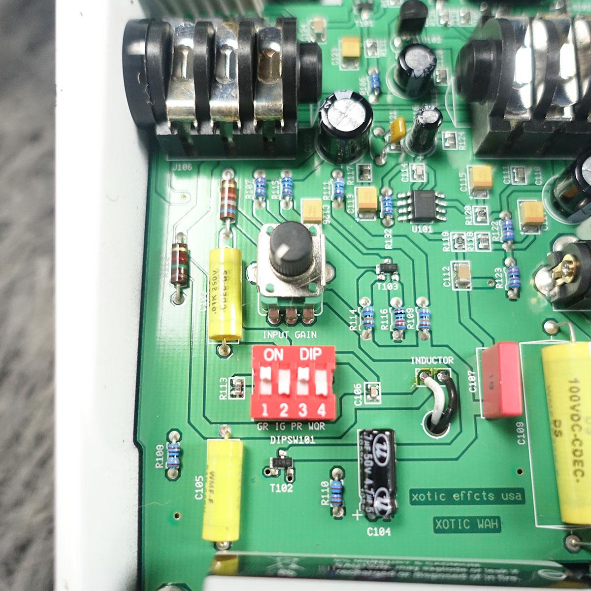 BIAS、WAH-Q、BASS、TREBLEの4つのツマミを搭載、内部にDIPスイッチ、インプット・ゲイン・トリマーを内蔵、これ一台でかなり音を作り込むことのできる仕様となっています。