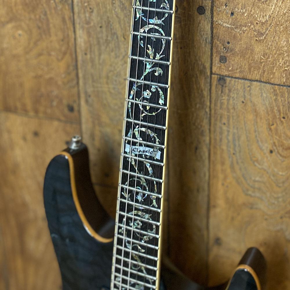 指板にはエボニー材を採用しており美しいインレイを施された魅力的なデザイン。