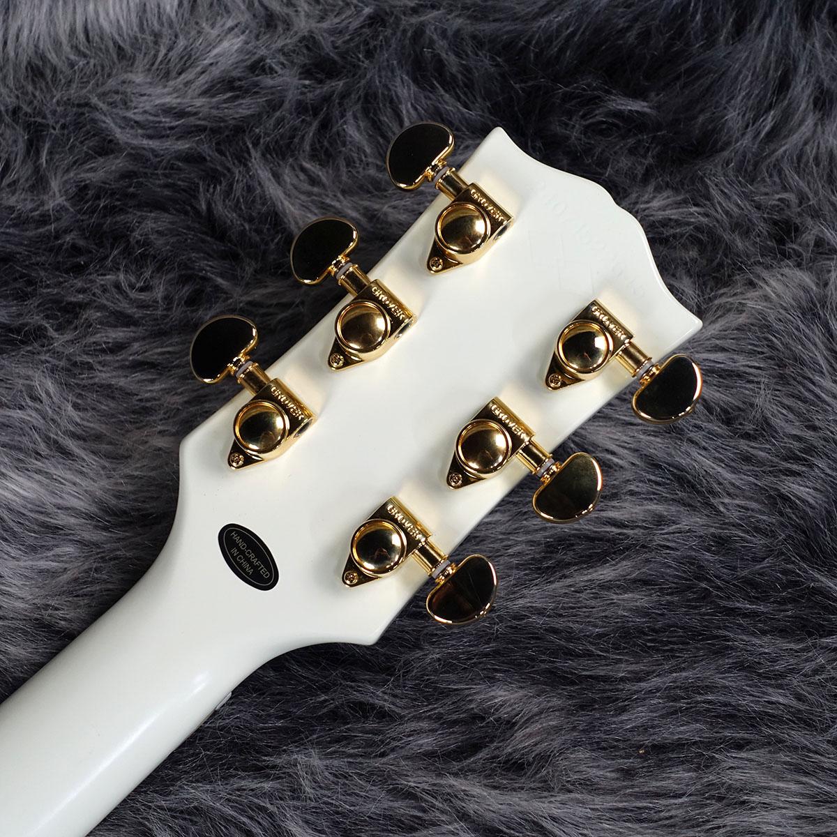 電装パーツも充実しており、3 基のGibson Custombucker ハムバッキング・ピックアップ、CTSポテンショメーター、Malloryコンデンサー、Switchcraftピックアップセレクター・トグルスイッチ、アウトプット・ジャック等がハンドワイヤリングにて結線されています。VOS(ビンテージ・オリジナル・シーン)仕上げによる鮮やかなクラシック・ホワイト色はゴールド・ハードウェアにより一層引き立てられています。ギア比18:1 のGrover Locking Rotomaticチューナーを搭載。