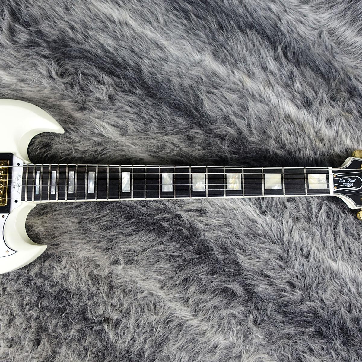 美しいホワイトのボディに、ゴールドパーツ、ボックスインレイが輝く黒黒としたエボニー指板、多層バインディングなど、まさしくSG Customといったビジュアル。