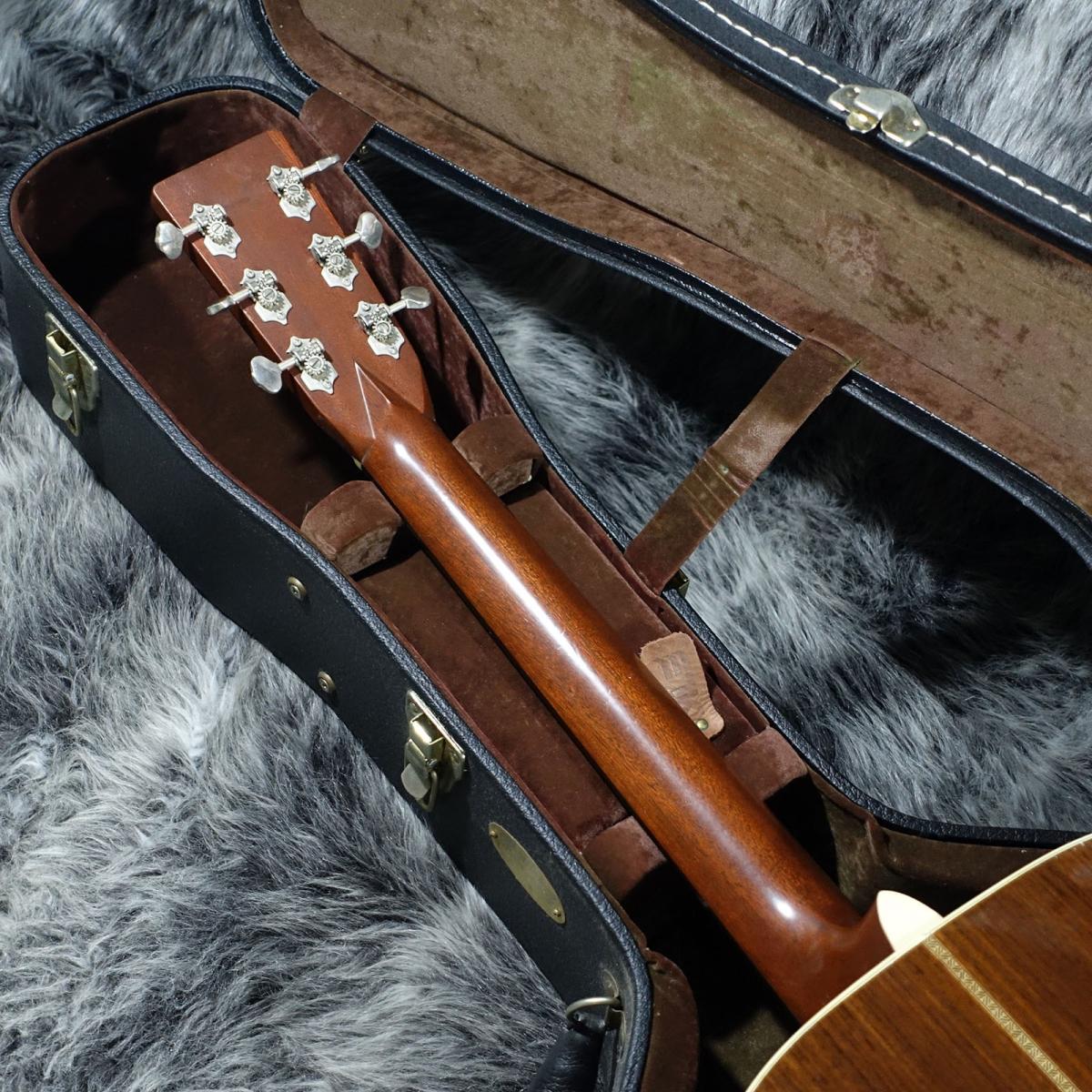 ヘリンボーン・トップトリムにアイヴォロイド・バインディング、 スロッテッド・ダイアモンド・インレイ、ベッコウ柄ピックガード などの装飾面はもちろん、バタービーン・ペグやロング・サドル、 Vシェイプ・ネックなどの仕様を持っています。