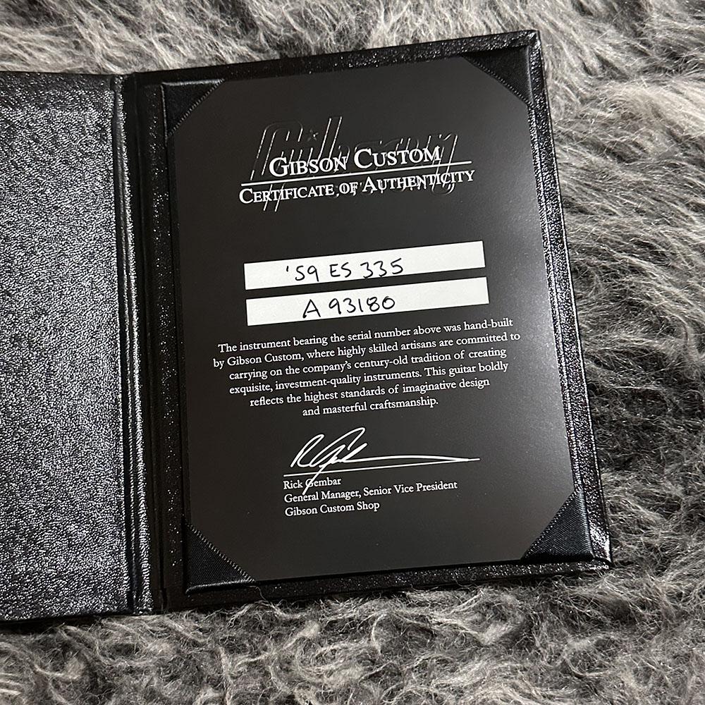 アルミテールピース、ノンワイヤーのABR-1ブリッジ、肉厚なグリップ感のネックシェイプ、ソリッドセンターブロックを採用するなど、1959年製のES-335の特徴をしっかりと再現した拘りの一本。