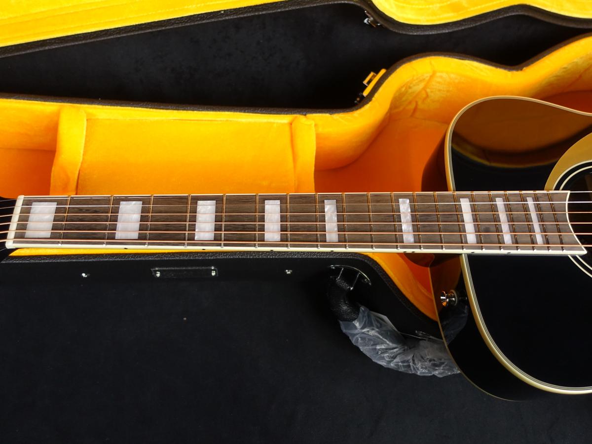 バインディングされたオバンコール指板には当時の雰囲気を再現するパーロイドのブロックインレイが施されています。