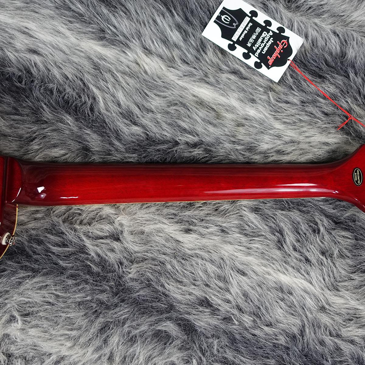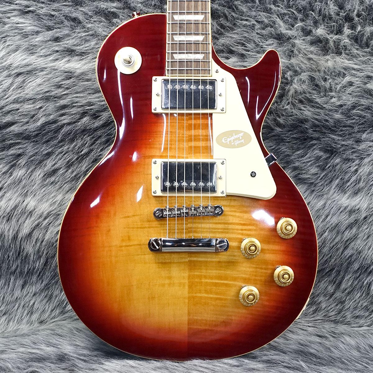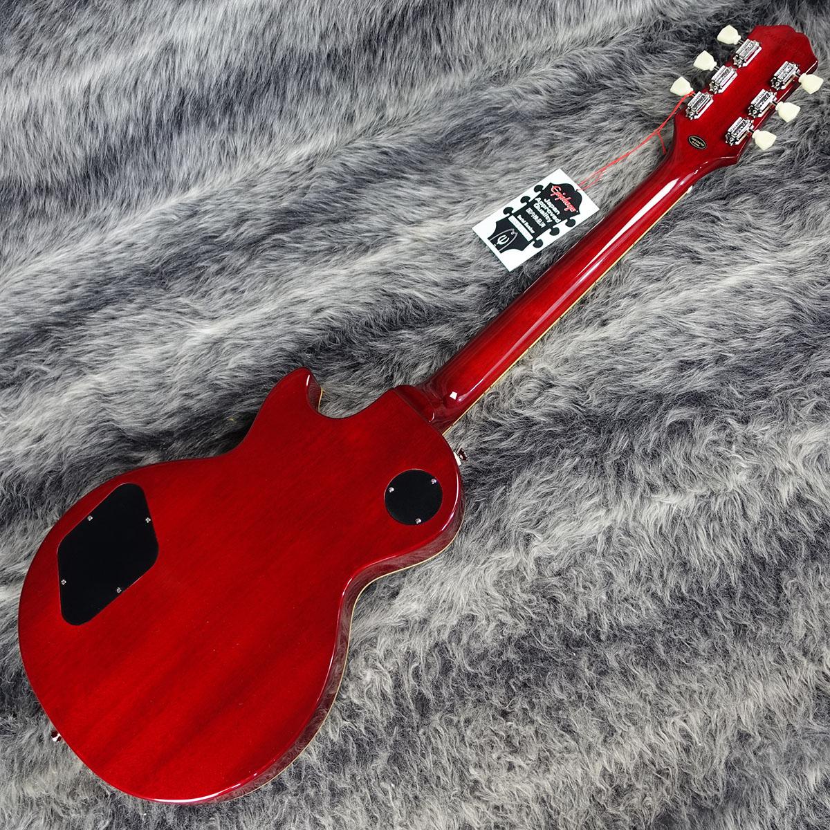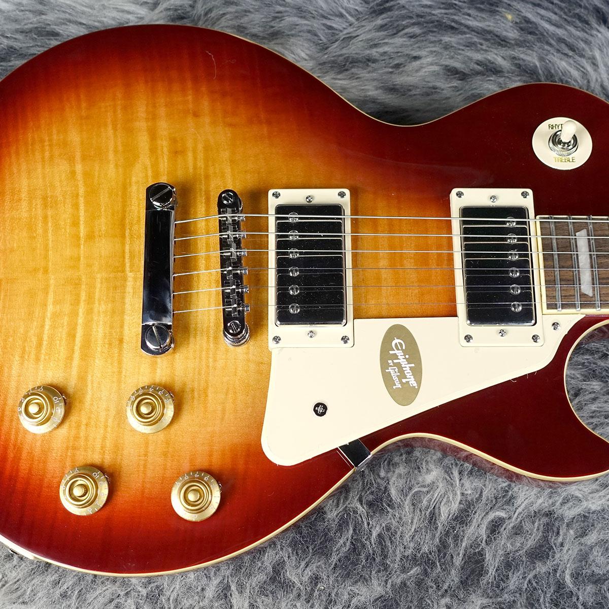 グロス仕上げのボディにメイプルトップ(フィギュアドトップのモデルにはAAAグレードのフレイム・メイプル化粧板)の材構成をもち、ロング・ネック・テノン仕様でジョイントされた50sシェイプ・ネック、クラシカルなディッシュ・インレイが施されたインディアン・ローレル指板、新開発のヴィンテージ・デラックス・チューナー、定評のあるエピフォンProBuckerハムバッカー、ダイヤル・ポインタ付きのゴールド・トップハット・ノブなど、充実の仕様群を誇ります。