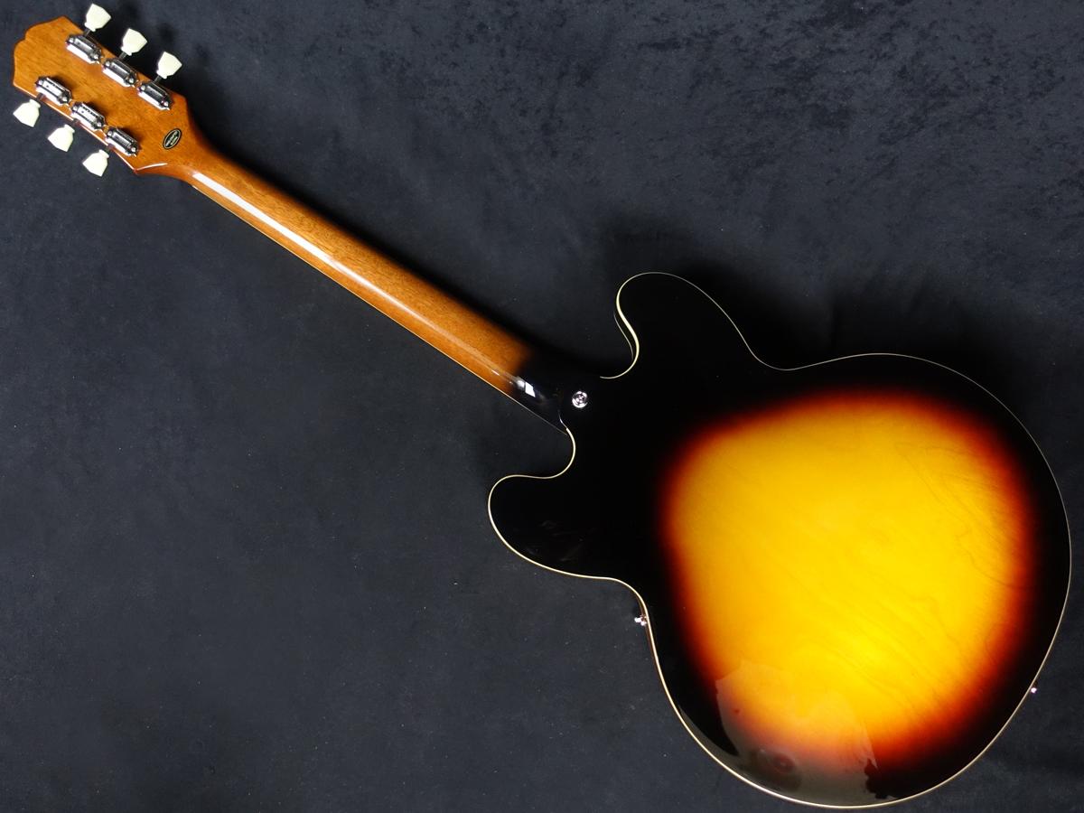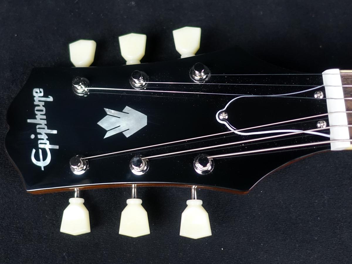 合板メイプルのトップ・サイド・バック、メイプルのセンターブロックのウッドマテリアルに、エピフォン製アルニコクラシックPROハムバッカーを搭載。