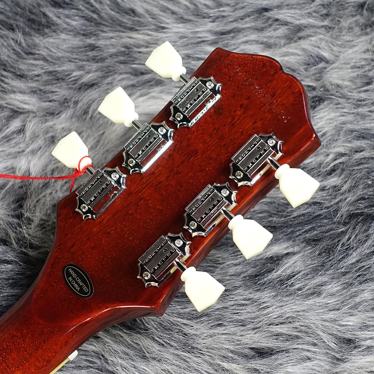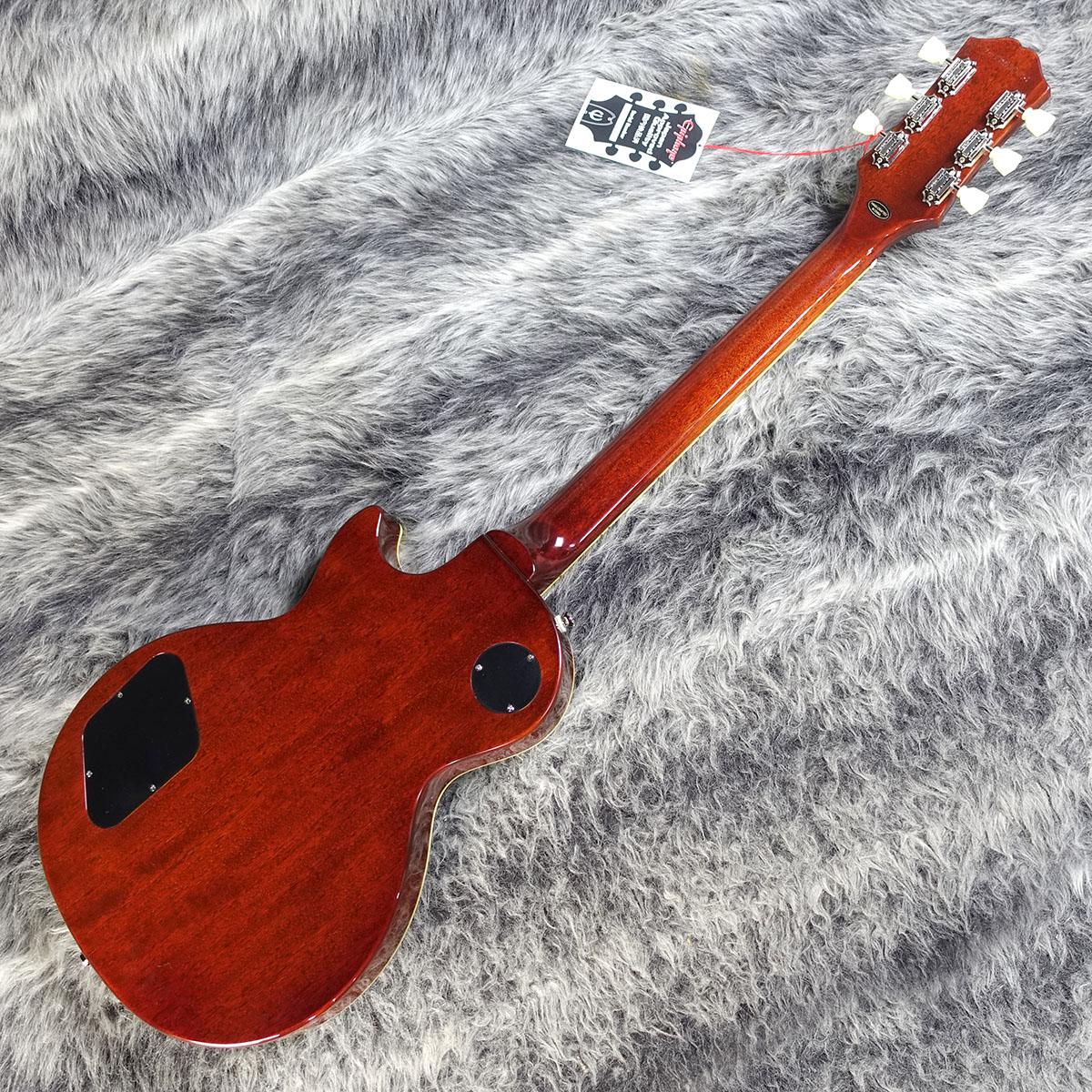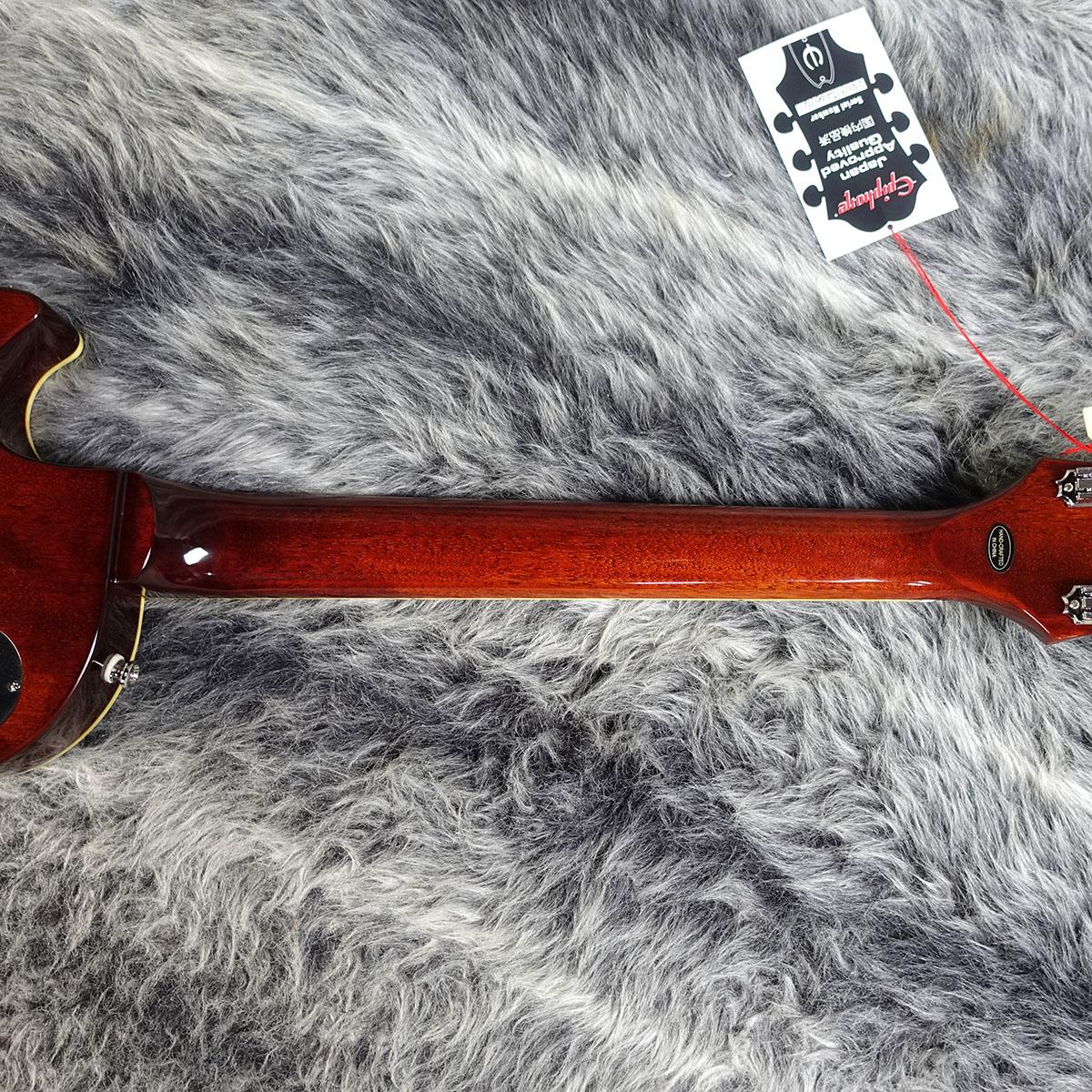 ボディ・トップにはメイプルが貼られ、上面にはAAA グレードのフレイム・メイプル化粧板があしらわれています。1959ラウンド・ミディアム・Cシェイプのネックにはバインディングが施され、ロング・ネック・テノン方式でボディにジョイントされています。ローレル指板にはクラシカルなディッシュ・インレイが施され、カラマズー・ヘッドストックにはヴィンテージ・デラックス・チューナーを搭載。電装系には定評のある2基のProbuckerハムバッカー・ピックアップ、ダイヤル・ポインタ付きのゴールド・トップハット・ノブを採用。Graph Techナット、CTSポット、往時の製法に則った配線など、拘りの仕様群により魅力が一層高められています。Epiphoneプレミアム・ギグバッグが付属となります。