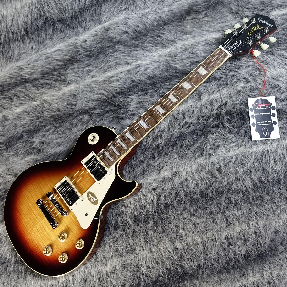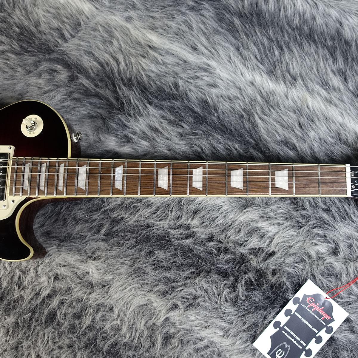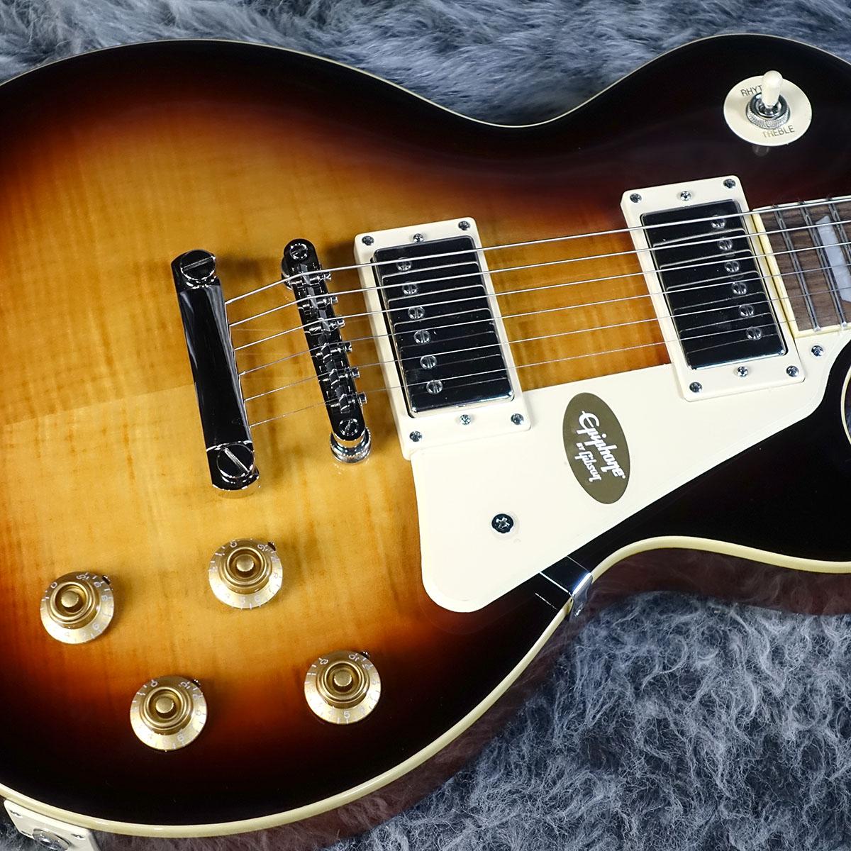 ボディ・トップにはメイプルが貼られ、上面にはAAA グレードのフレイム・メイプル化粧板があしらわれています。1959ラウンド・ミディアム・Cシェイプのネックにはバインディングが施され、ロング・ネック・テノン方式でボディにジョイントされています。ローレル指板にはクラシカルなディッシュ・インレイが施され、カラマズー・ヘッドストックにはヴィンテージ・デラックス・チューナーを搭載。電装系には定評のある2基のProbuckerハムバッカー・ピックアップ、ダイヤル・ポインタ付きのゴールド・トップハット・ノブを採用。Graph Techナット、CTSポット、往時の製法に則った配線など、拘りの仕様群により魅力が一層高められています。Epiphoneプレミアム・ギグバッグが付属となります。