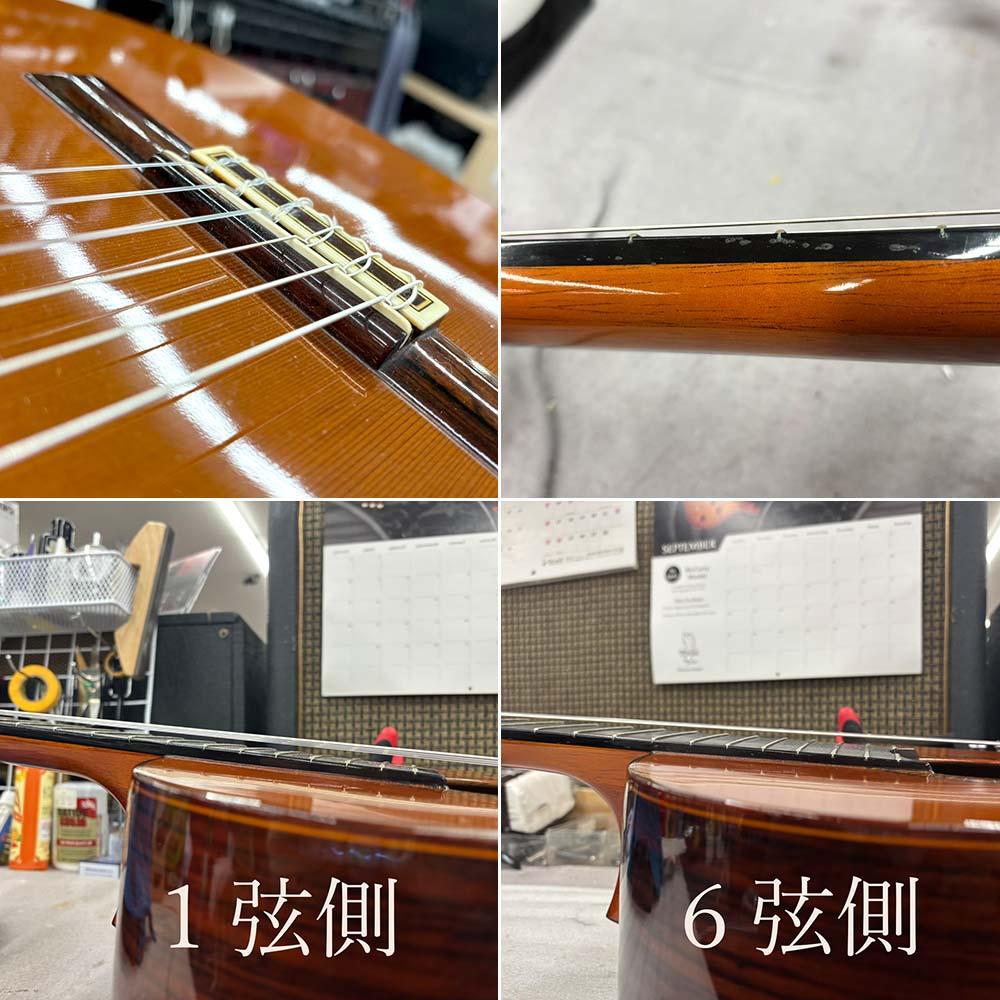ネックはやや順反り気味で弦高は12F上1弦で3.5mm、6弦で5.5mmと標準よりも高めです。数値で見るとかなり高く感じますが、1弦側に比べて6弦側の指板が薄くなっており、体感上はそれほど弾きづらさは感じない印象です。ビビリや音詰まりなどなく演奏していただけるコンディションです。