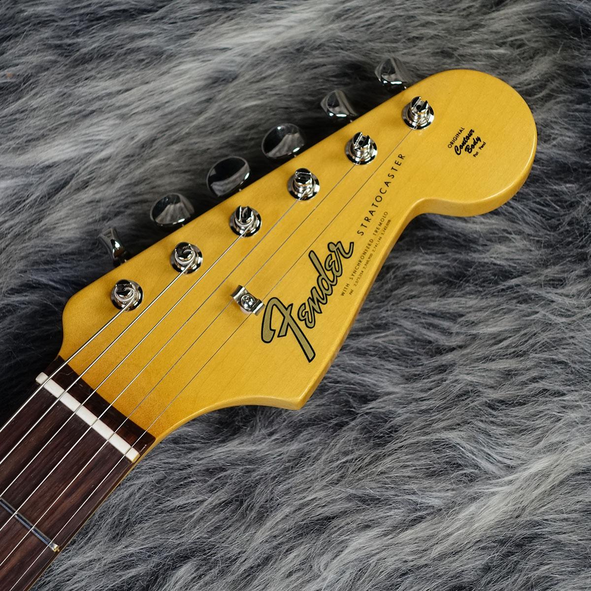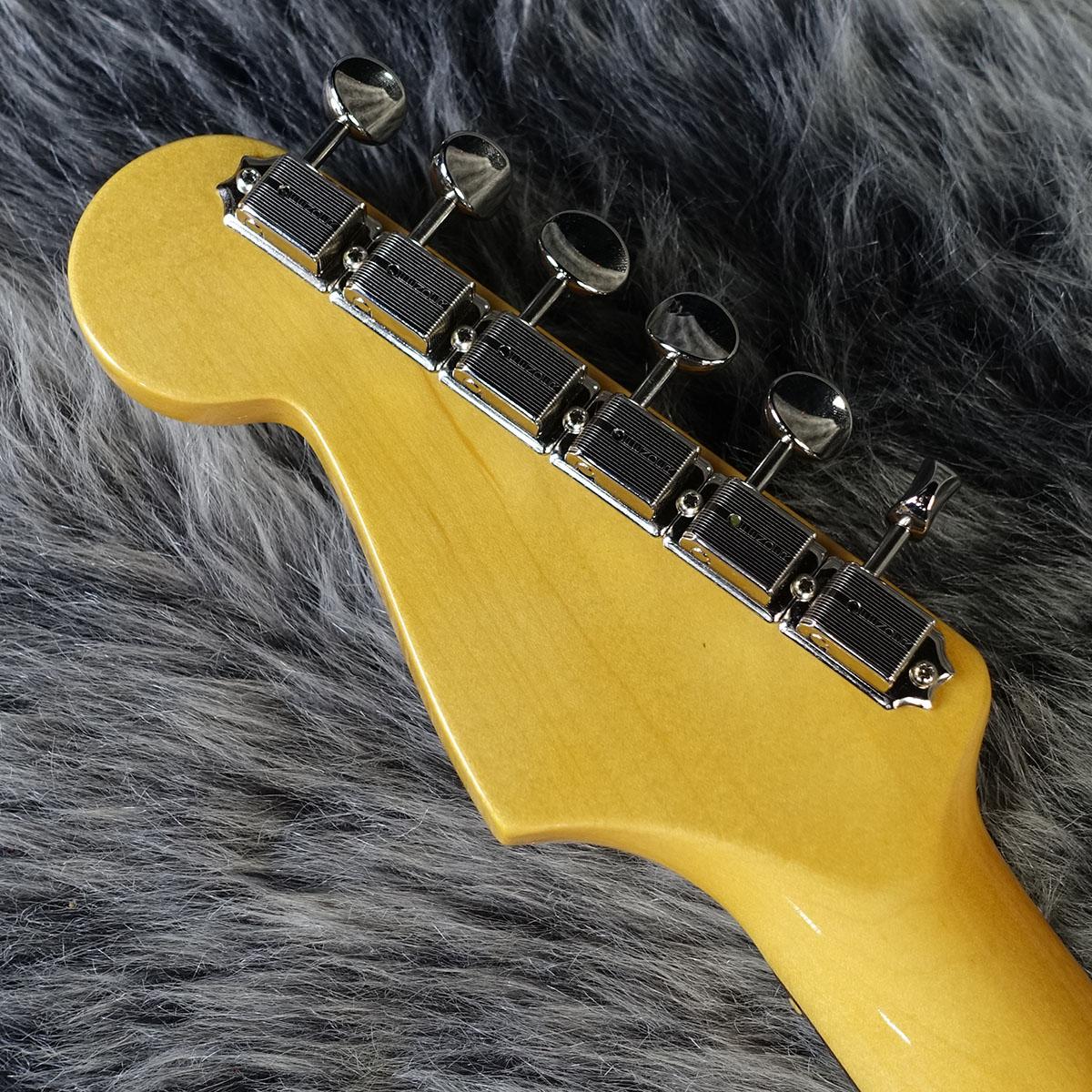 1965 Stratocasterは、1965 “C”シェイプメイプルネックに、大きめのパールドットインレイを採用したラウンドラミネイトローズウッド指板を備えているのが最大の特徴です。その他、11ホールの3-plyホワイトピックガード、大きめのレタリングを採用したトランジションロゴ、”グレーボトム” Pure Vintage 1965ピックアップセットなどのオーセンティックな特徴を備えています。