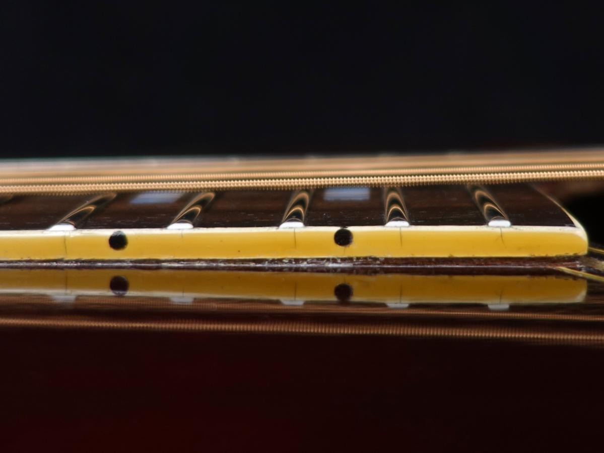 フレット(ハイポジションを除く)及びナットはオリジナルをキープしておりますが、オリジナルのフレットが元々幅が広く/背の低い仕様につき、全体的に4割程度の残りといったところ。