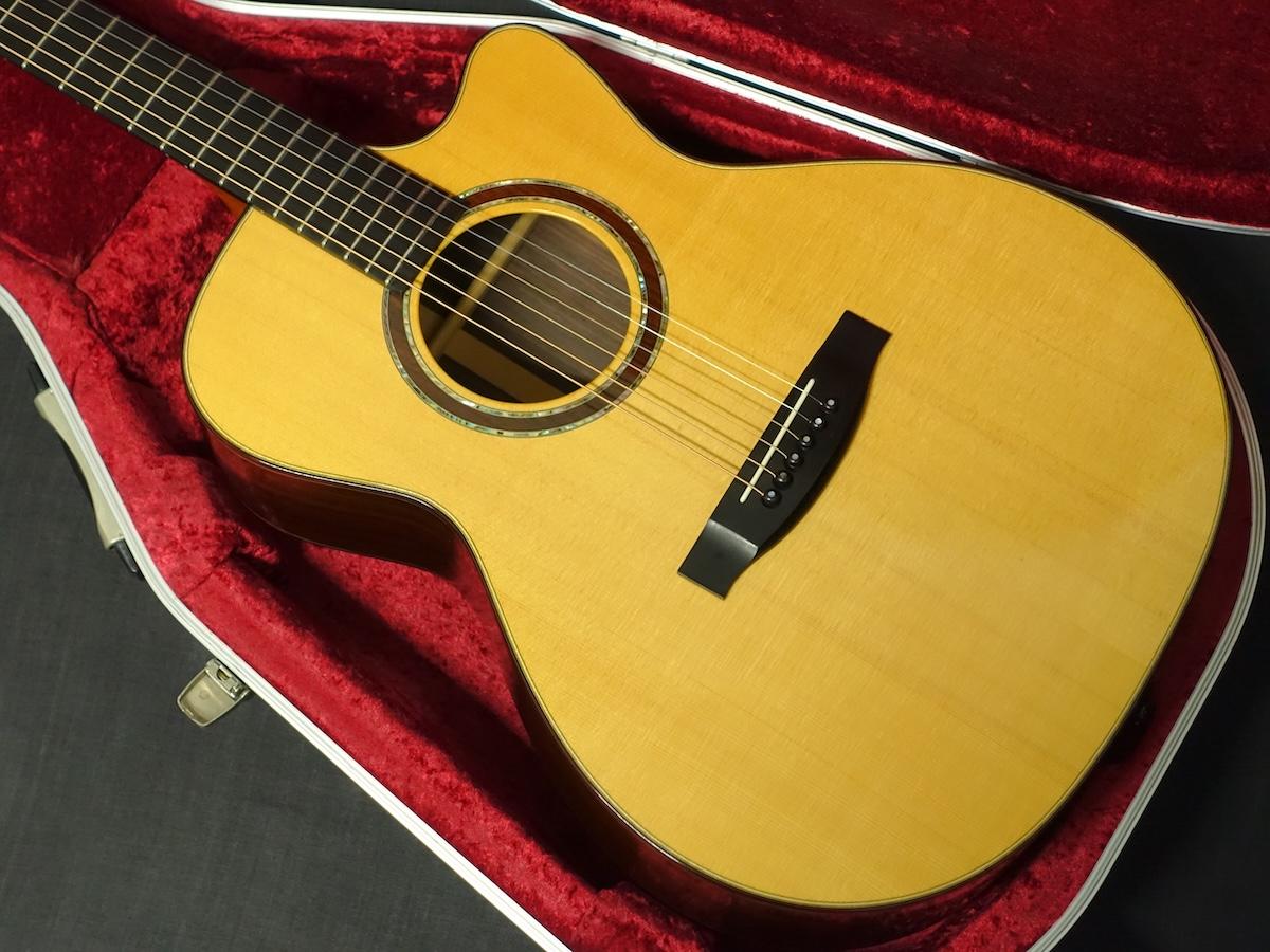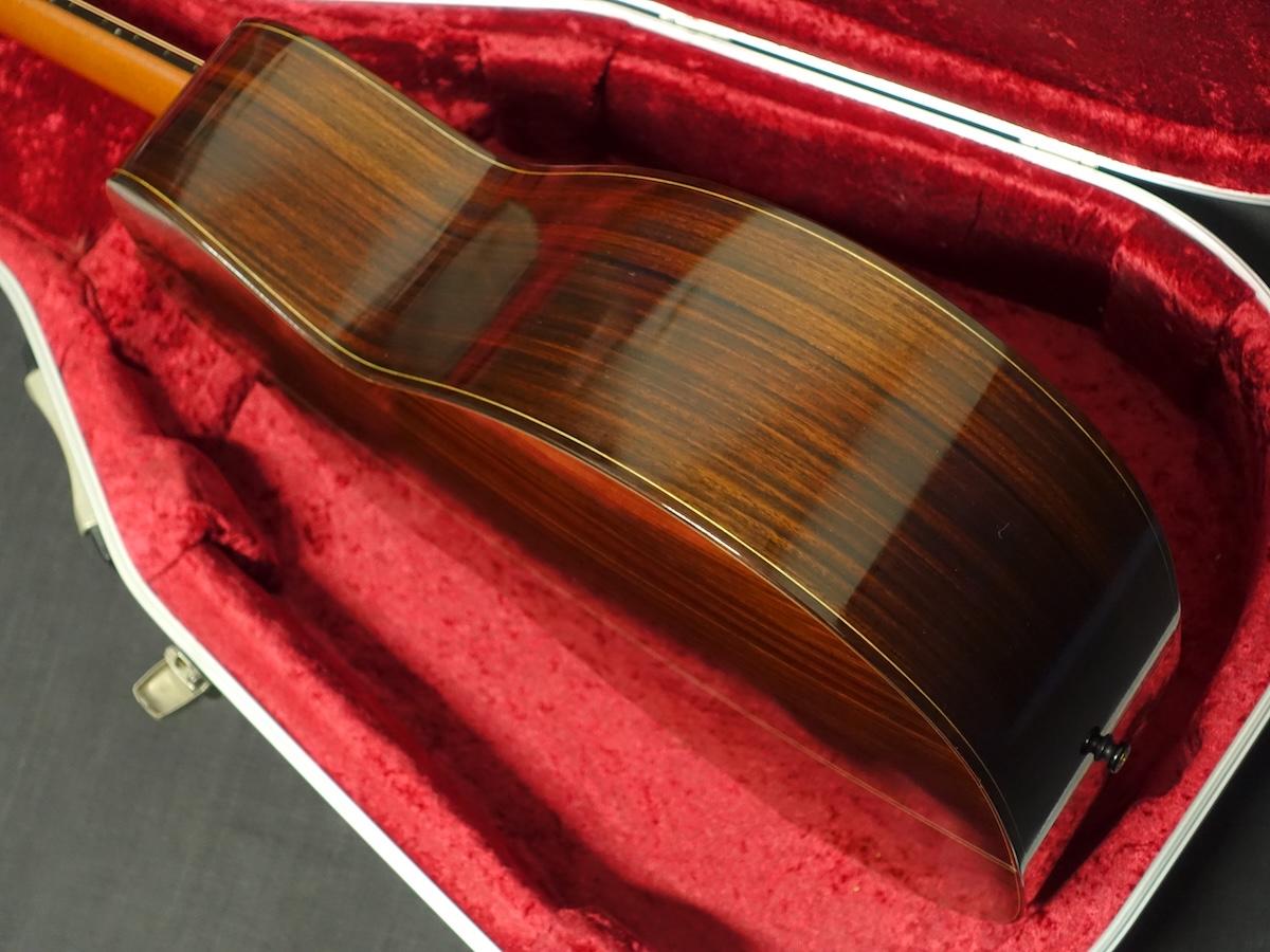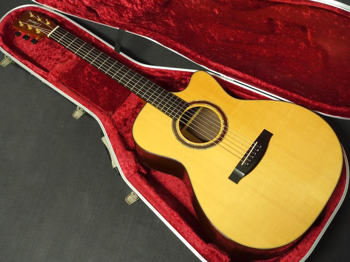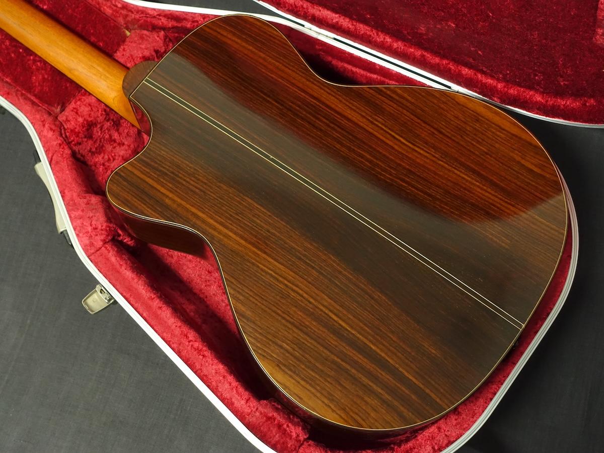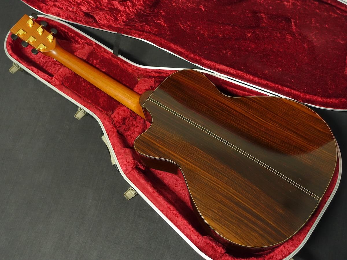 詳細な資料がございませんので外観からの判断となりますが、スプルーストップ、ローズウッドサイド&バックのカッタウェイボディに、マホガニーネック、エボニーフィンガーボードをセットしたウッドマテリアルと思われます。