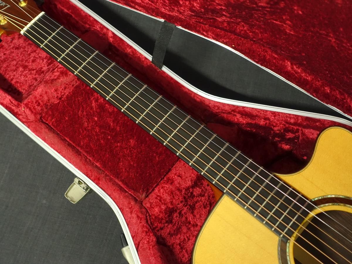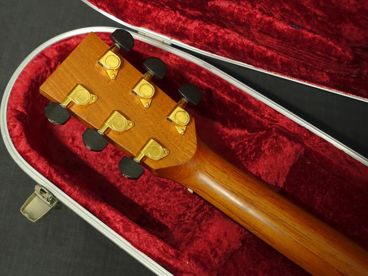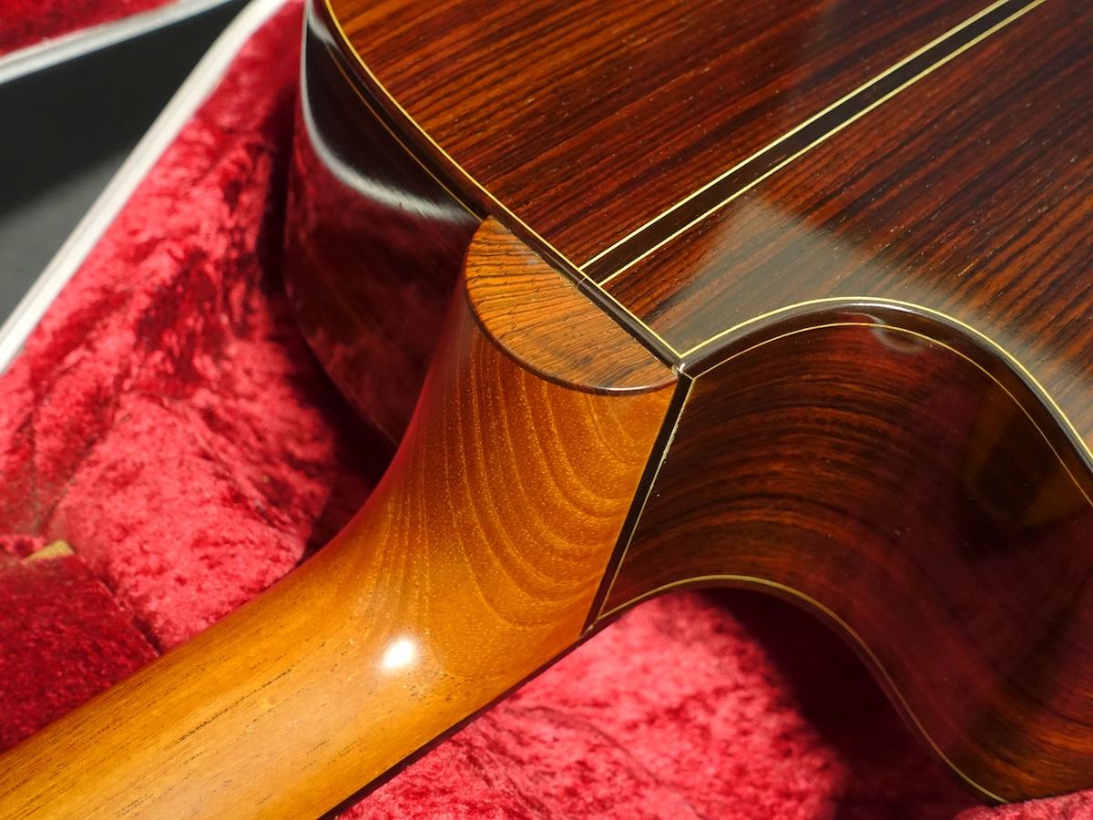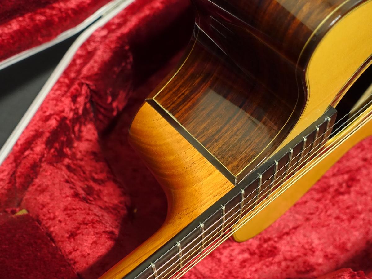 ネックジョイント部分の塗装が僅かに浮いており、また年代相応の使用感はございますが木部へ影響するような致命的なダメージは見当たりません。フレットはローポジションを中心に減りや凹みがあり、全体的には7割以上を残しております。弦高はやや高めですが、現状ネックにハイ起きや捩れなどの症状は見られず、トラスロッドも余裕がある状態です。