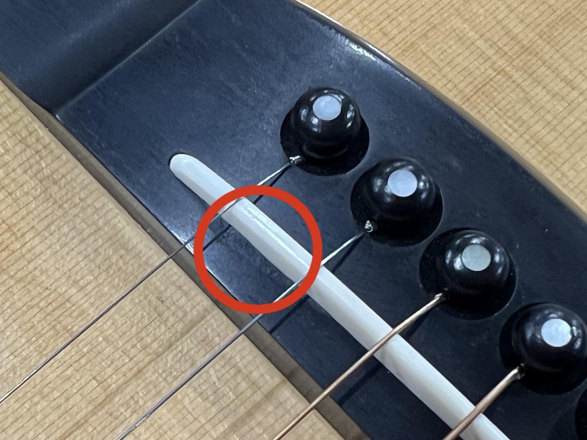 ブリッジのサドル溝付近におそらく埋め木をしたと思われる補修痕が確認できます。