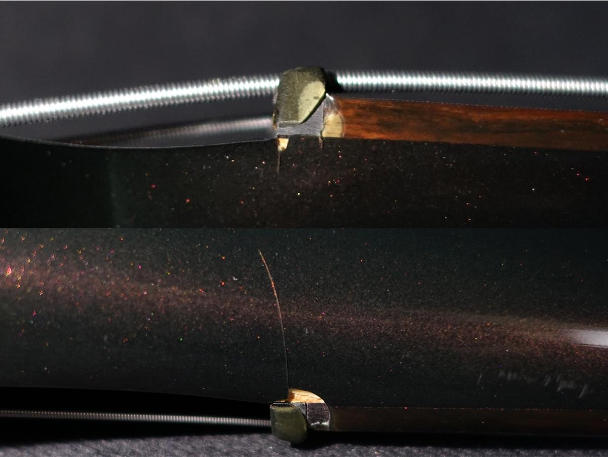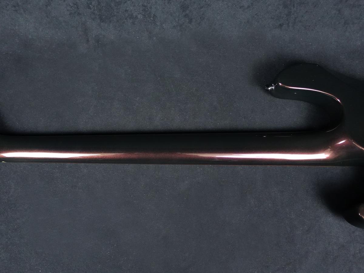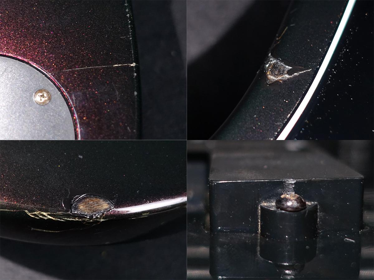 コントロールキャビティ付近に割れ、ボディトップ右側エッジ部分・ボディバック右下部エッジ部分に木部の露出を伴う1cm程の塗装欠け、フロントピックアップカバーにビスが干渉したと思われる擦り傷、ナット両サイドに塗装チップが見受けられる他、