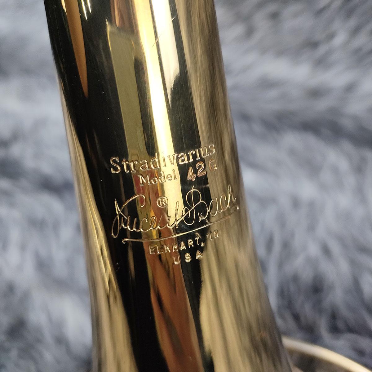 本機はトラッドな仕様のStradivarius 42Bのベル材にレッドブラスを採用しラッカーで仕上げた一本。