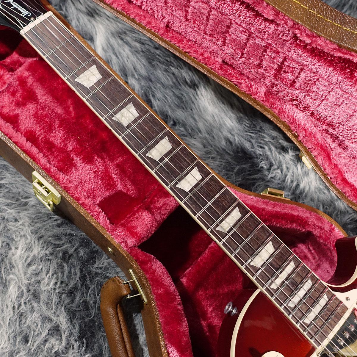 このモデルは、ソリッド・マホガニー・ボディにプレーン・メイプル・トップ、マホガニー・ネックは丸みを帯びた50s ヴィンテージ・プロファイルで、ローズウッド指板と台形インレイが施されています。