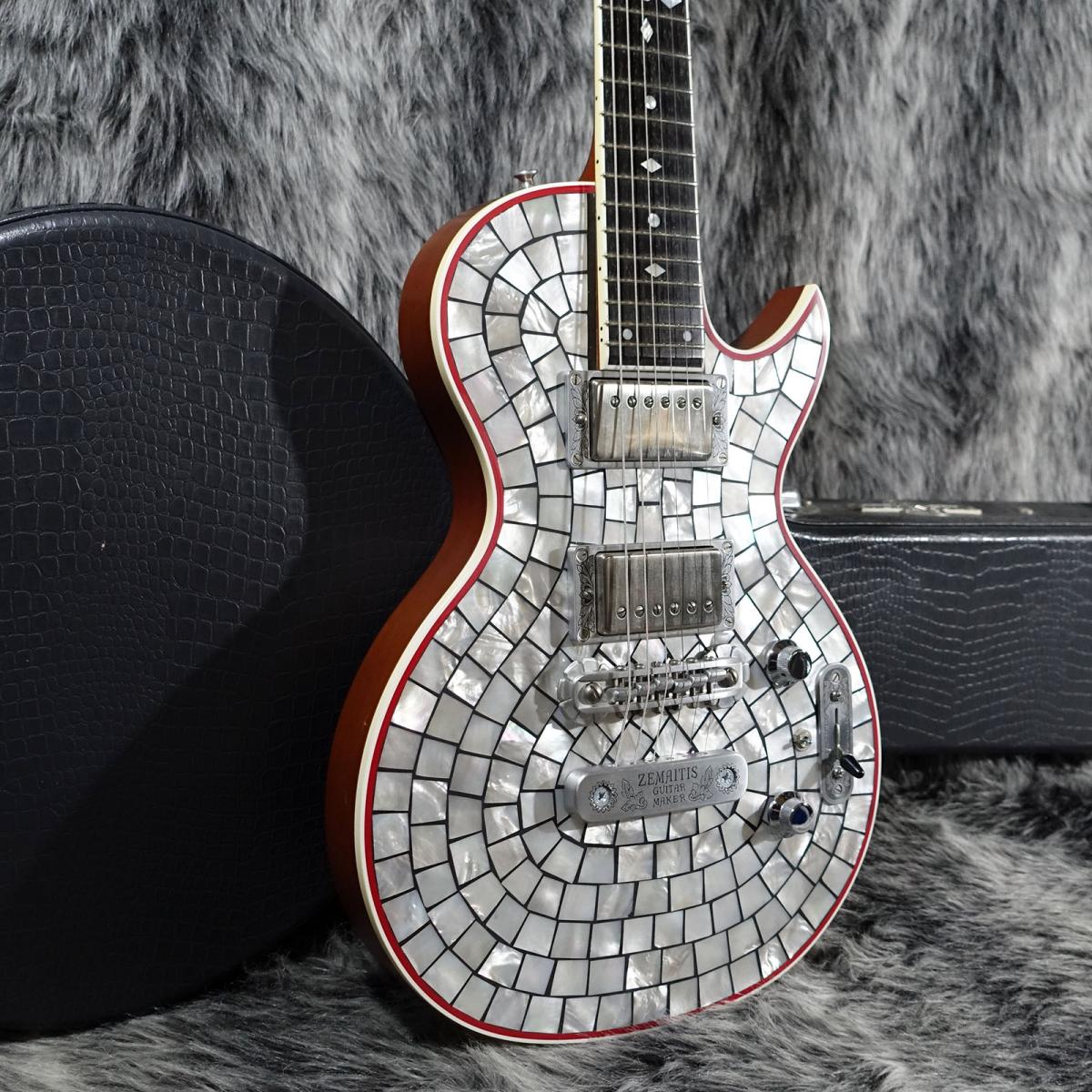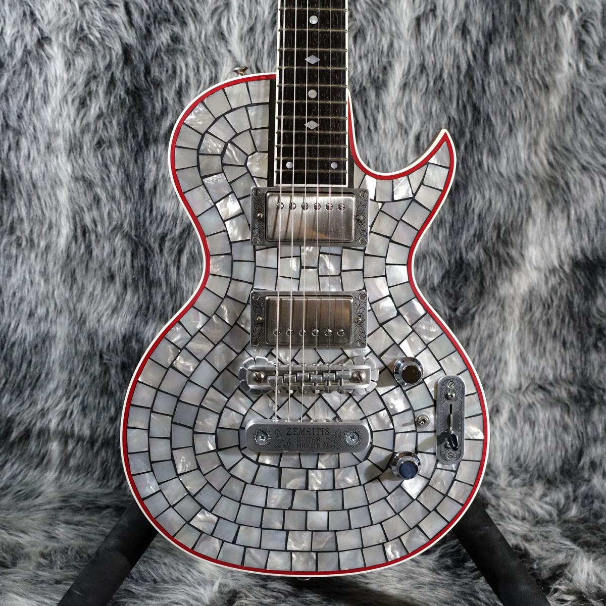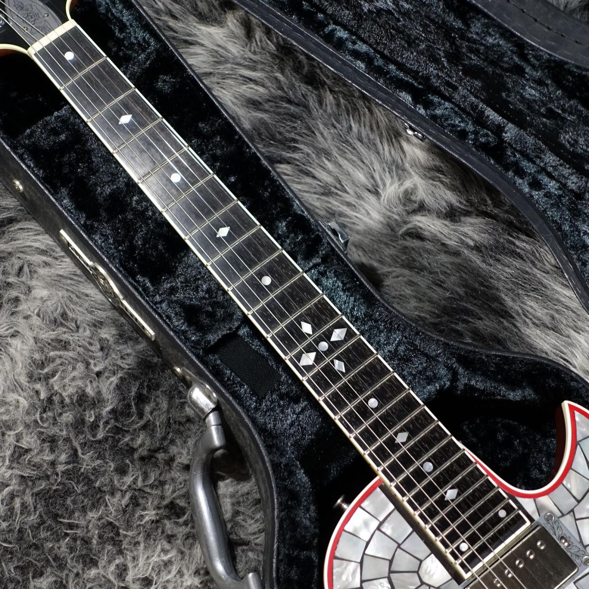 ボディトップには美しい白蝶貝が敷き詰められており、隙間をグレーのパテで埋め、外周に赤いバインディングを配する事で非常にアクセントのあるルックスに仕上がっております。
