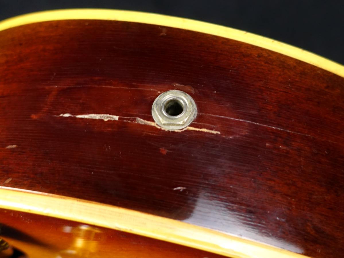 全体に弾き傷やウェザーチェック、無数の打痕、塗装ハゲなどが散見される他、目立った部分ではジャック部分にありがちなひび割れ及びオーバーラッカーやボディバック下部に複数のボツボツとした塗装の反応跡が見受けられるなど、年式相応にプレイウェアや補修歴が見受けられるコンディション。