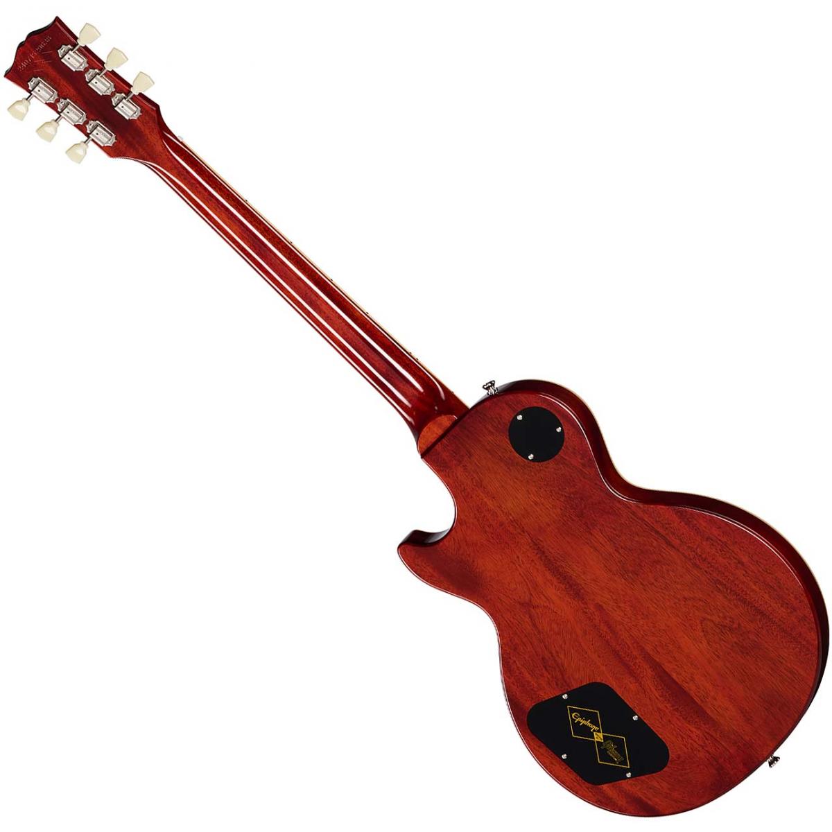 本モデルでは、ワンピース・マホガニー・ネック(ロング・ネック・テノン仕様)を採用し、豊かなサステインを実現。1959年ラウンデッド・ミディアムCネック・プロファイルを採用し、バインディングが施されたローズウッド指板を備えています。さらに、マザー・オブ・パールのトラペゾイド・インレイ、エイジド加工を施したEpiphoneロゴ、シルクスクリーン印刷されたゴールド色の「Les Paul Model」の文字が入ったギブソン・スタイルの“オープンブック”ヘッドストックを採用。サイドドットの位置やサイズも、1959年当時のLes Paul Standardと同じ仕様になっています。ジェニューイン・マホガニー材のボディにメイプル・トップが貼られ、トップには美しいAAAフレイムメイプル化粧板があしらわれています。