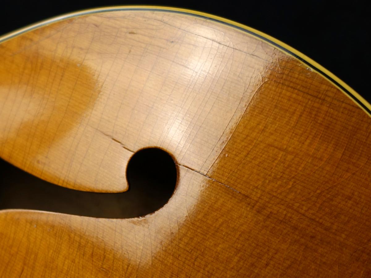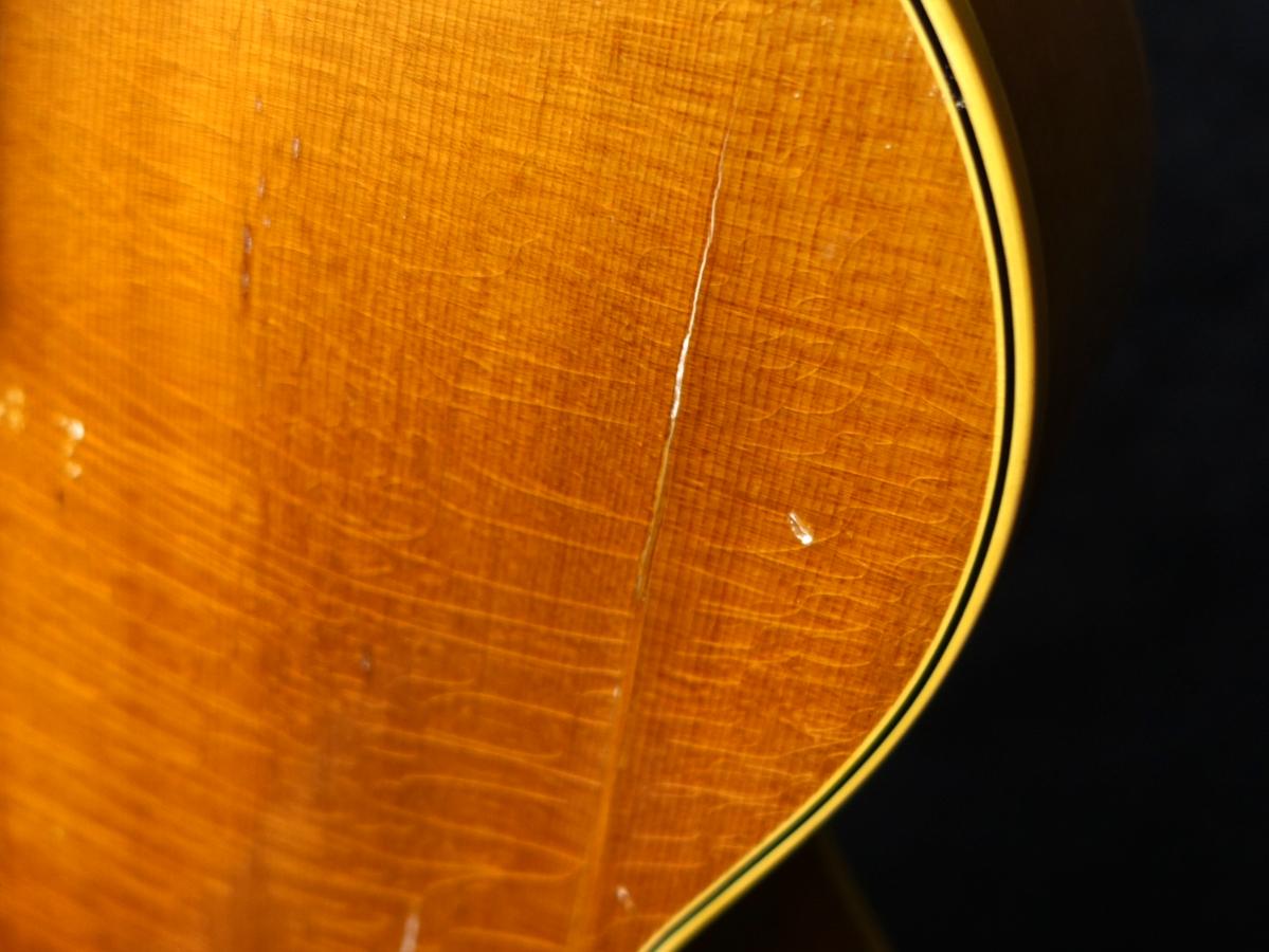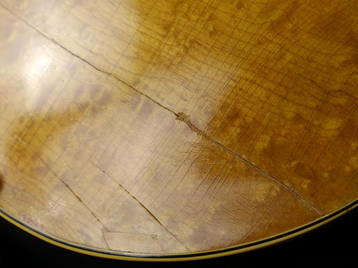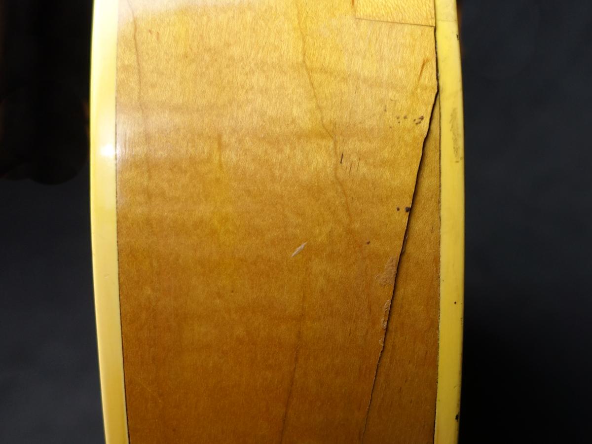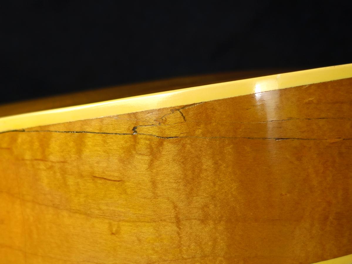 ボディ全体に無数のクラックや木部欠損やそれらの補修跡が散見される他、