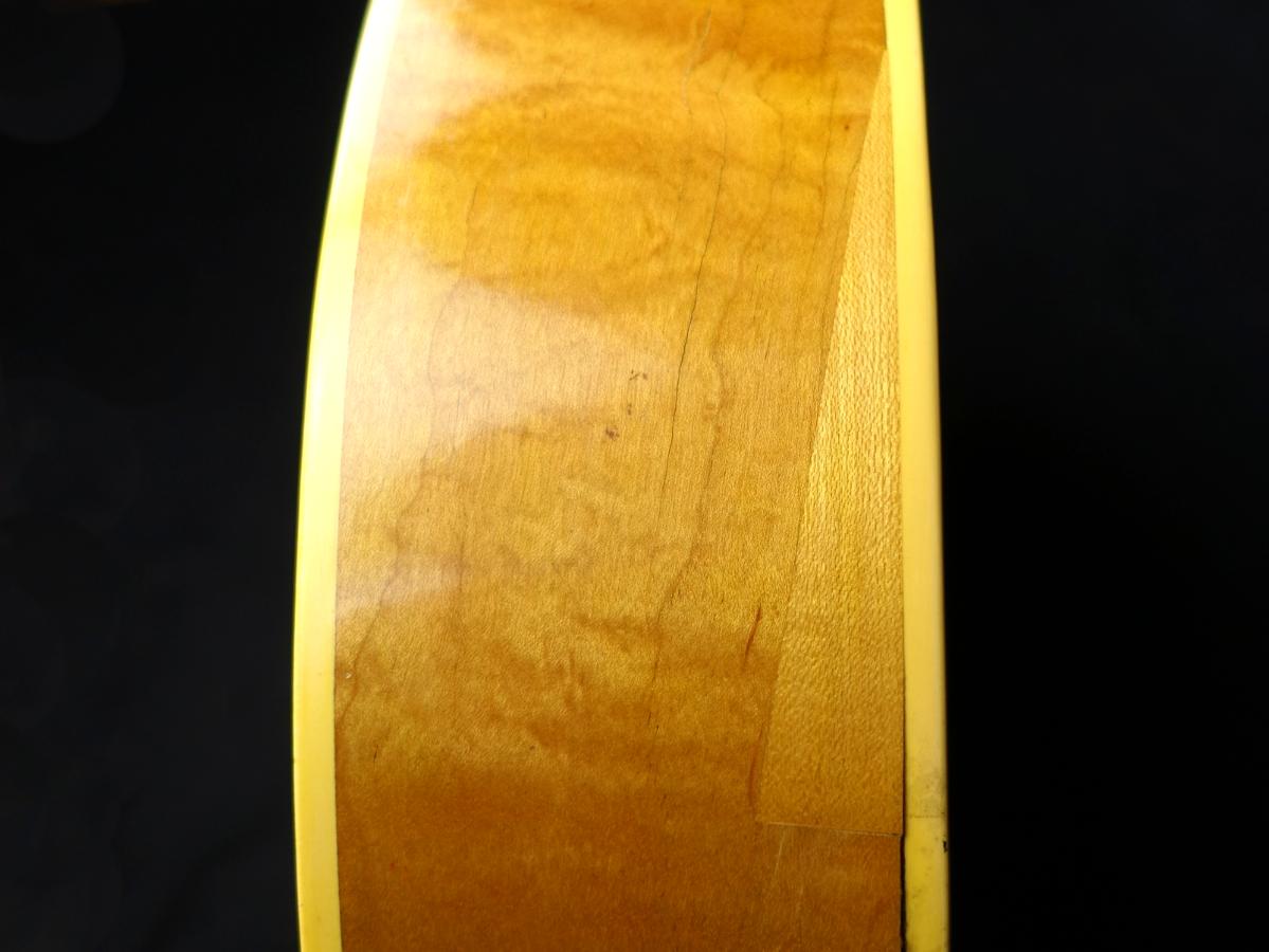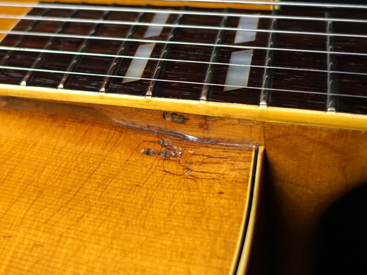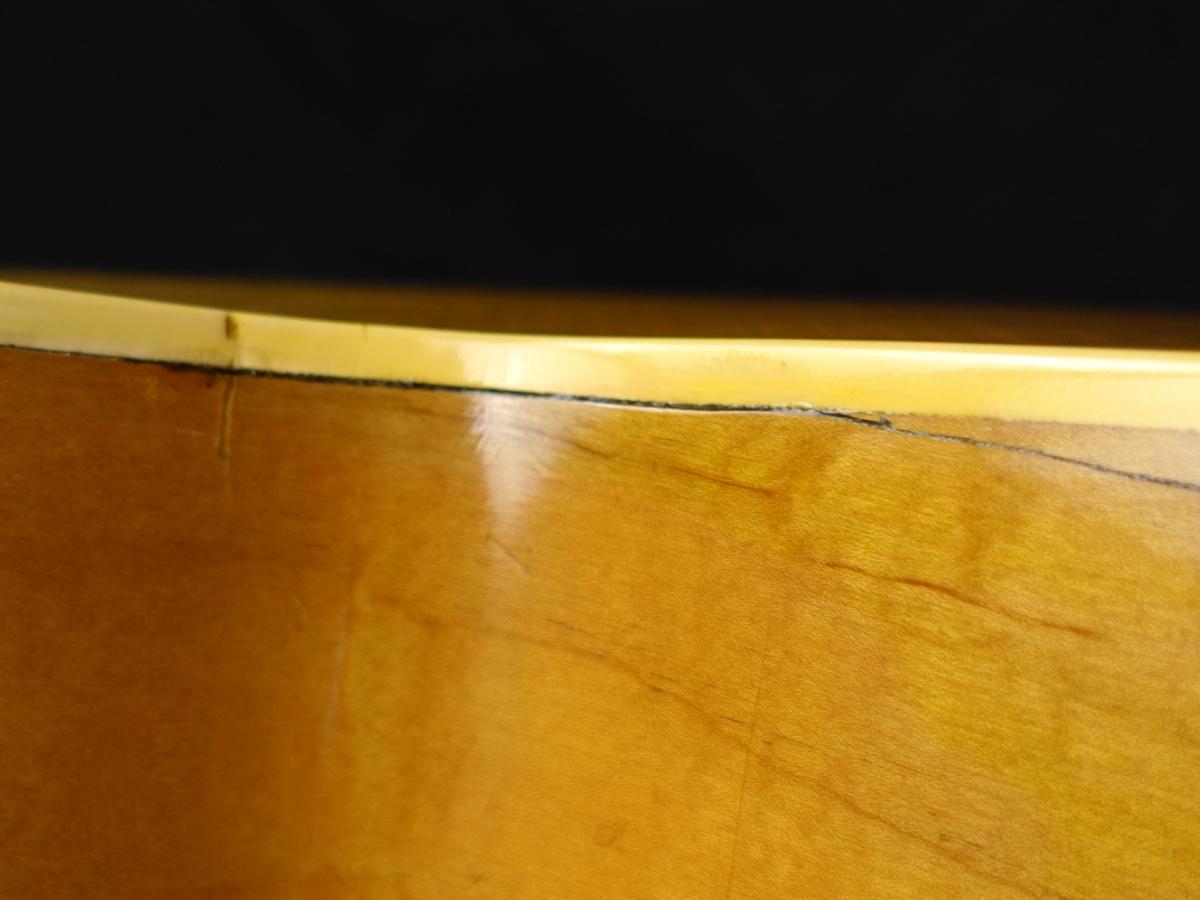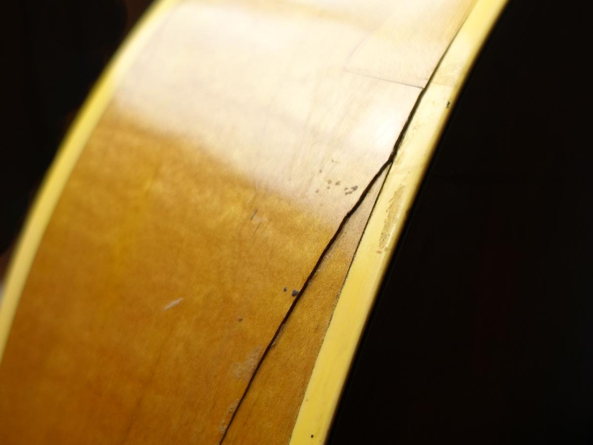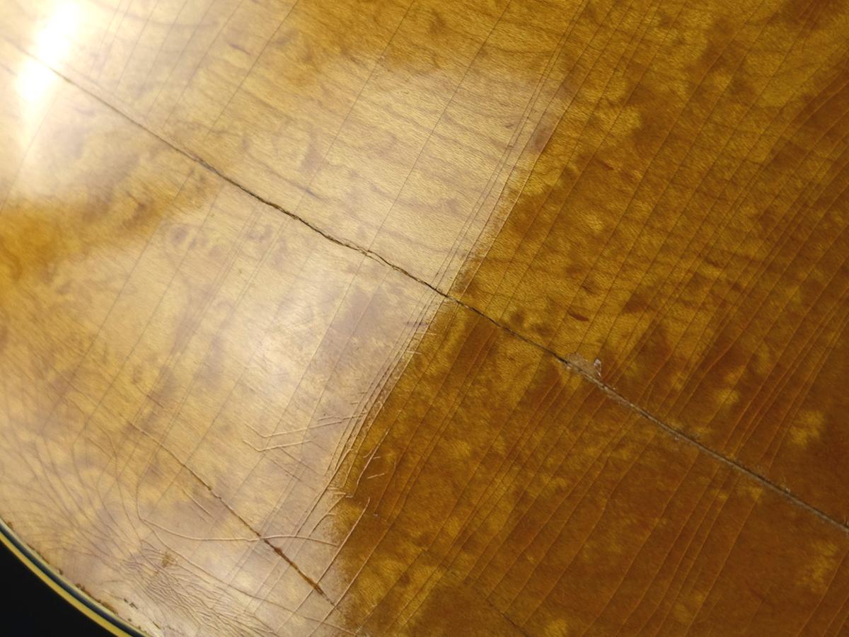 ボディ全体に無数のクラックや木部欠損やそれらの補修跡が散見される他、