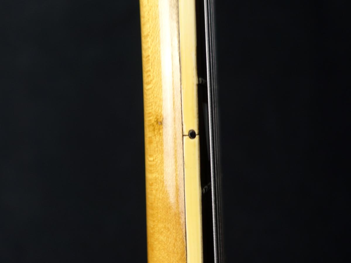 ウォルナットのセンターラインが入った肉厚なメイプルネックに、ダブル・パラレログラム・インレイが施されたハカランダ指板&ブリッジというウッドマテリアル。