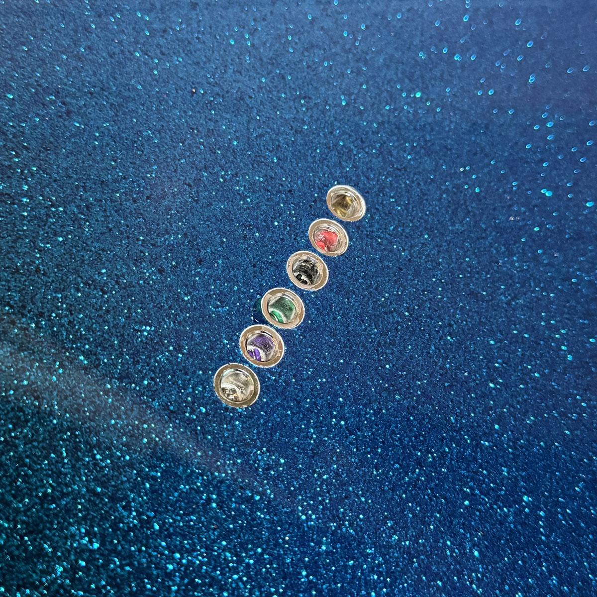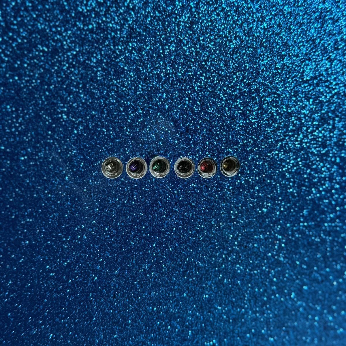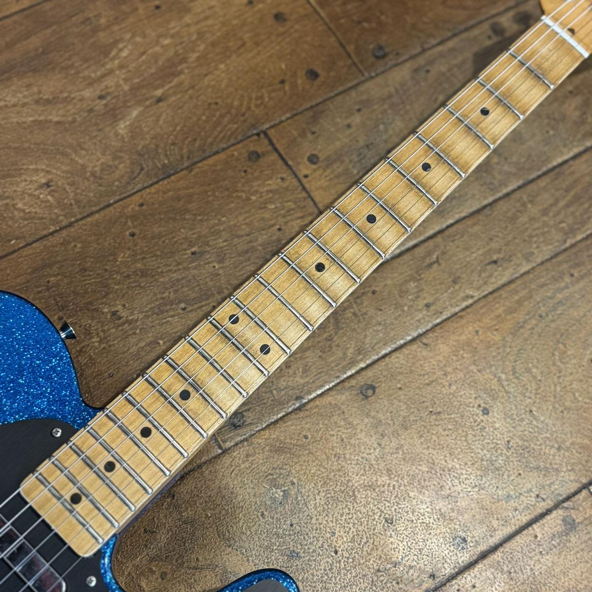 煌びやかなボトル・ロケット・ブルー・フレーク仕上げが施されたアルダーボディ、メイプル1Pネックを採用したウッドマテリアル。