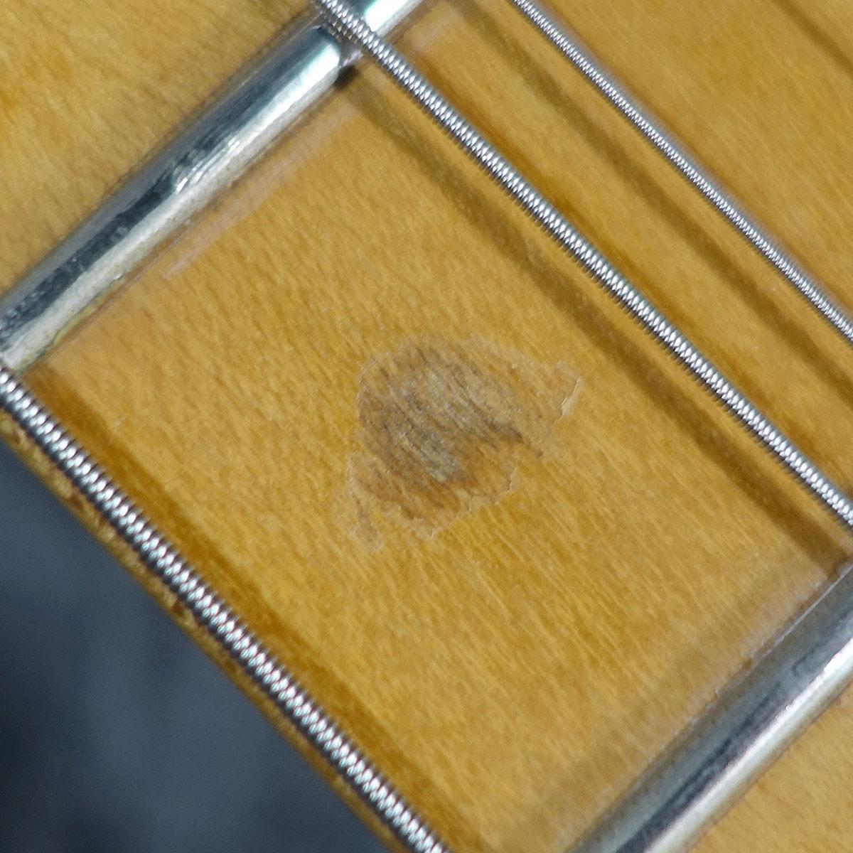 7-8フレット間に約2mmほどの指板の抉れたような打痕があり、6弦側ボディバックのサイドエッジに木部が見えるほどの塗装割れがあります。