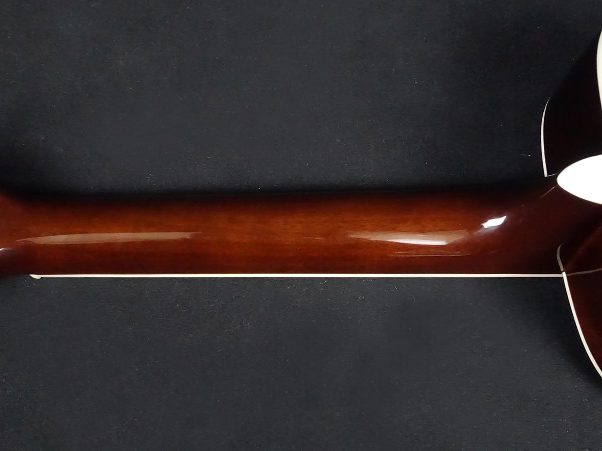 アコースティックギターのようなスクエアショルダーのボディスタイルが特徴的でトップ・ボディ・指板には白と黒のバインディングが施されています。