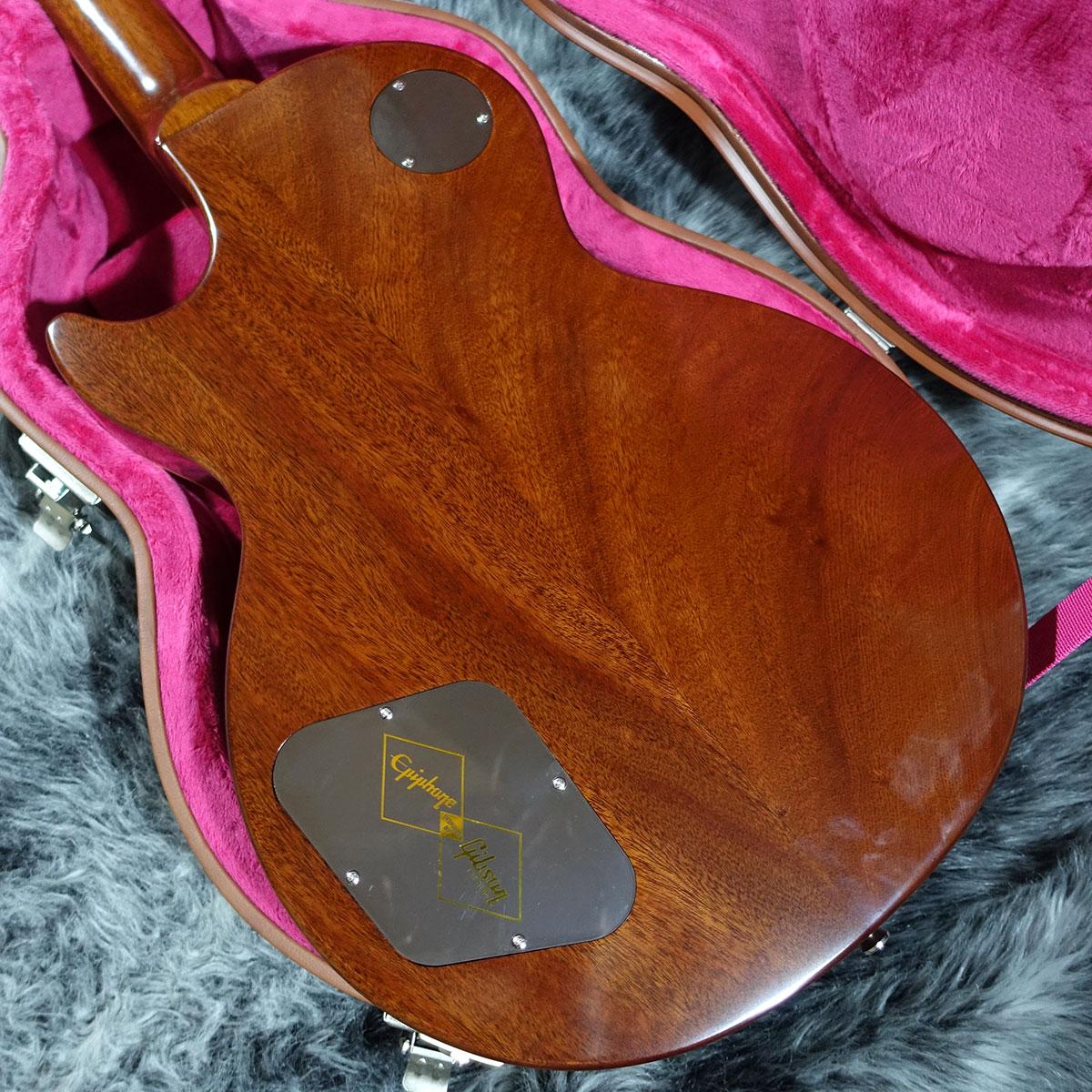 ネックにはワンピース・マホガニーを使用し、50年代スタイルのラウンド・ミディアムCプロファイルとロングネック・テノンを採用。安定した演奏性と豊かなサステインを実現します。バインディングを施したローズウッド指板にはマザー・オブ・パールのトラペゾイド・インレイを備え、22本のミディアム・ジャンボ・フレットを搭載。ギブソンと同様のオープンブック型ヘッドストックには、エイジド加工を施したマザー・オブ・パールのEpiphoneロゴと、シルクスクリーン印刷されたゴールド色の「Les Paul Model」の文字が入ります。さらに、サイドドットの位置やサイズまで1957年当時のLes Paul Standardと同様に設計されています。