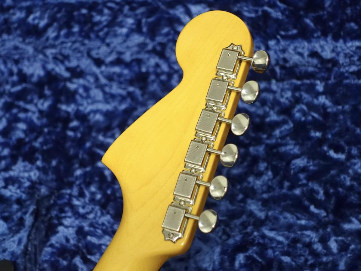 4ポジションスイッチによるシリーズ配線や、ローエンドを抑えてブライトに仕上げるスライドスイッチなど、多彩なサウンドメイクが可能。Mustangサドルを組み込んだ専用ブリッジや安定性の高いトレモロアームなど、演奏性にも徹底的にこだわっています。7.25インチラジアス指板にヴィンテージスタイルフレットを採用し、伝統的なJaguarらしさとモダンな実用性を両立。ニトロセルロースラッカー仕上げにより、使い込むほどに味わい深い経年変化を楽しめる、唯一無二のJaguarです。