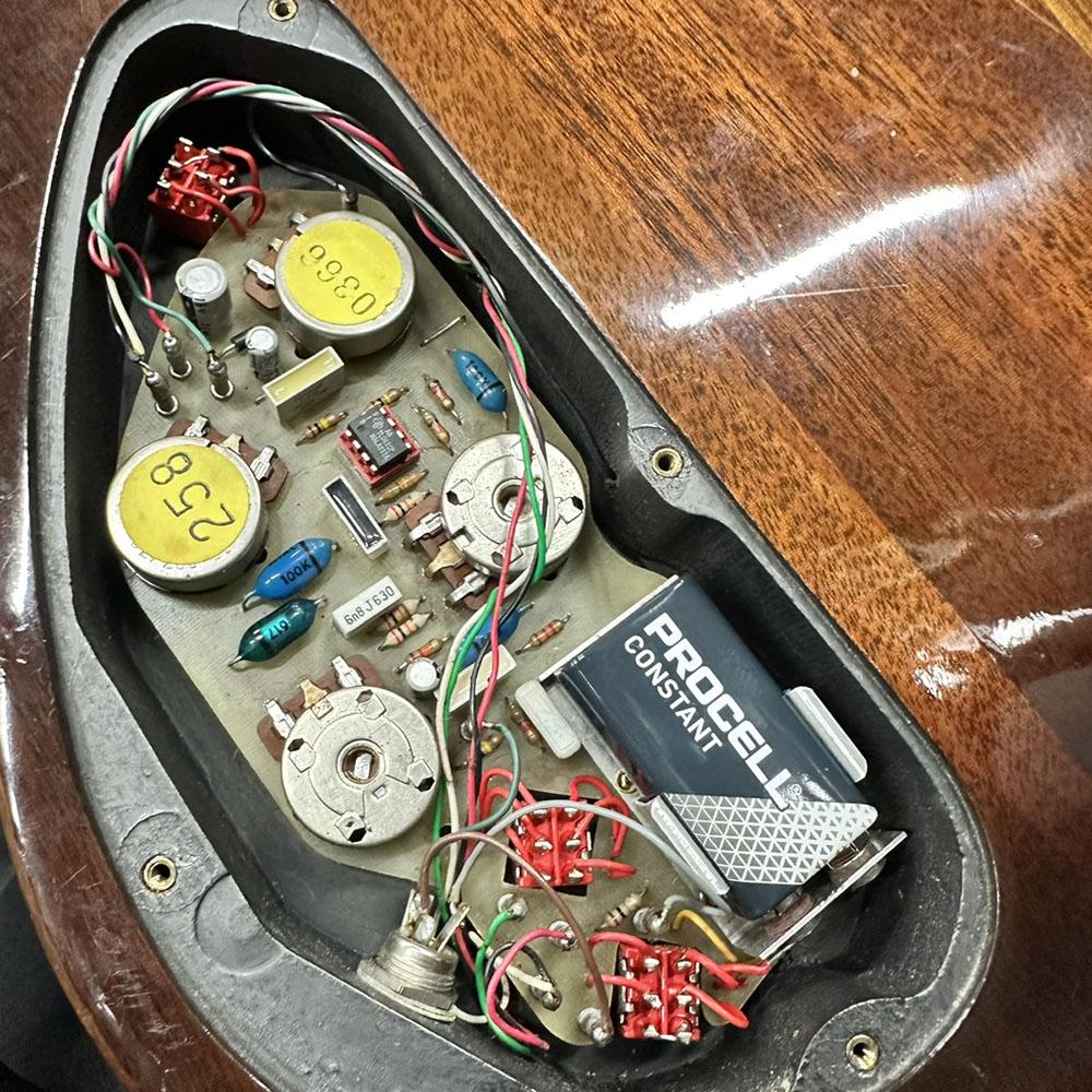 コントロールはピックアップ切り替えスイッチ、2Vol、トレブルEQ、ベースEQ、フェイススイッチ、プリアンプバイパススイッチです。