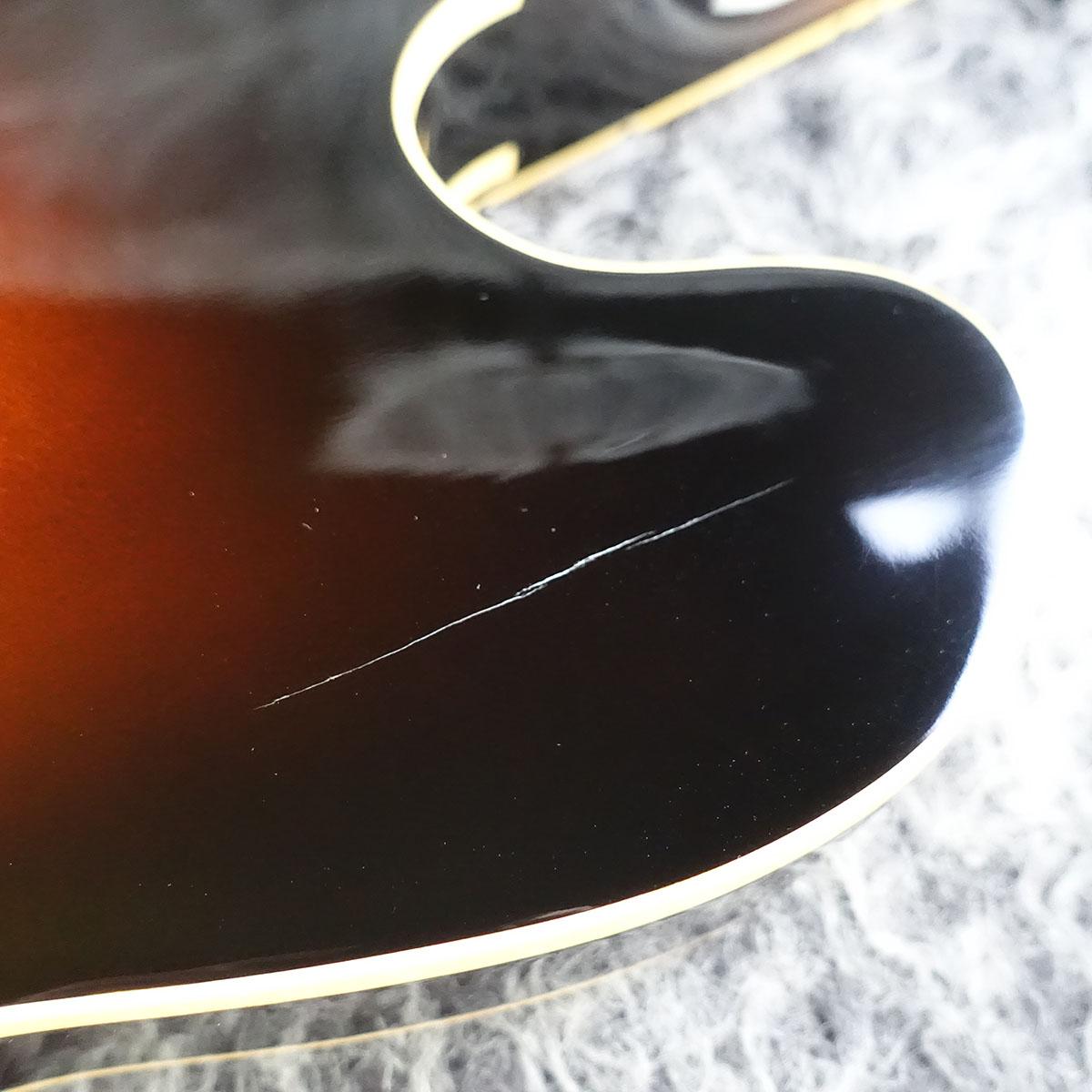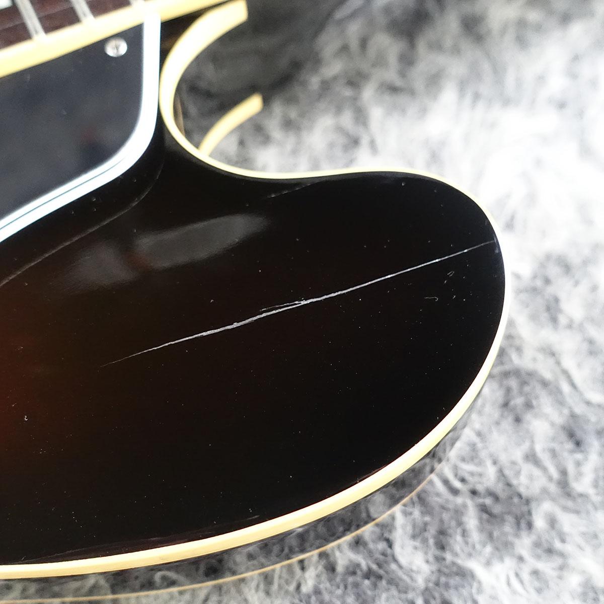 外観の目立つ傷としては、ボディトップ6弦側ホーンに割れ、ボディバック1弦側ホーンにクラックが見受けられ、いずれもエポキシパテにて簡易的な補修がされています。