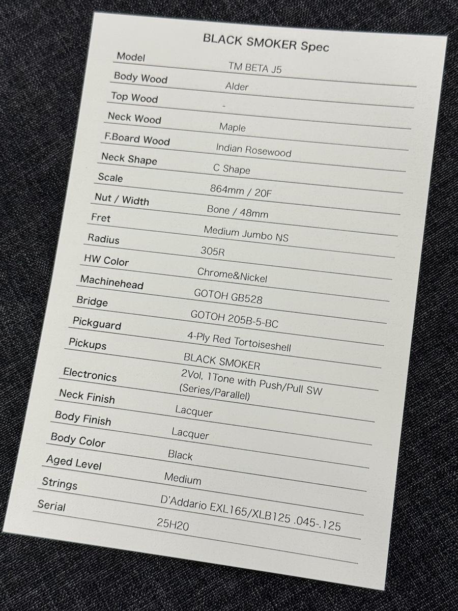 王道のJBスタイルをベースにしながらも、BLACK SMOKERならではの視点でブラッシュアップされた5弦モデル。アルダー・ボディにメイプル・ネック、指板にはインディアンローズウッドが使用されています。