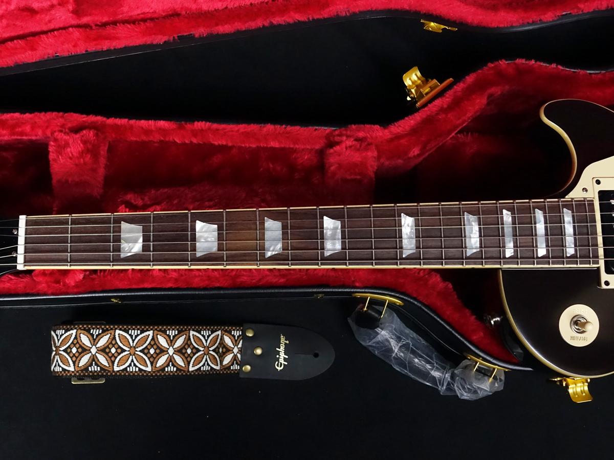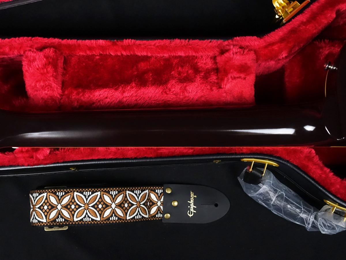 ヴィンテージ・スタイルのレプリカ・ストラップとInspired by Gibson Customグラフィック入りのEpiphoneハードシェル・ケースが付属します。