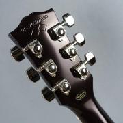 ローズウッド指板には22本のミディアム・ジャンボ・フレットが打たれ、エイジド加工が施されたマザー・オブ・パールのトラペゾイド・インレイで飾られています。