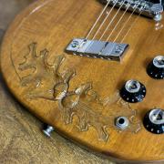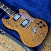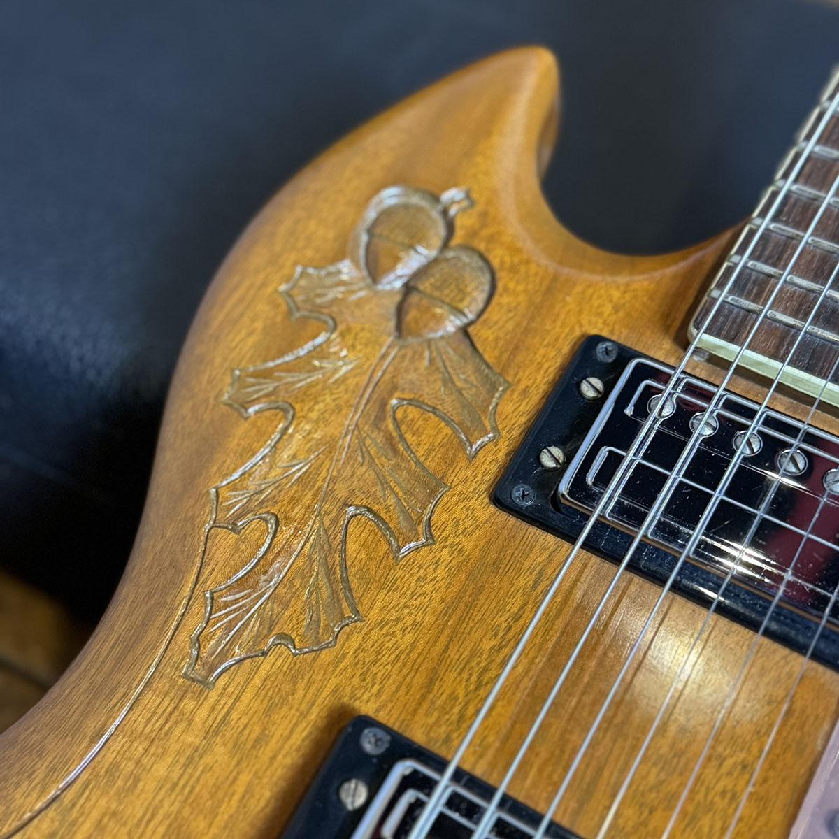 アシンメトリーデザインが美しいダブルカッタウェイボディに手加工によるAcorn彫刻が施されています。