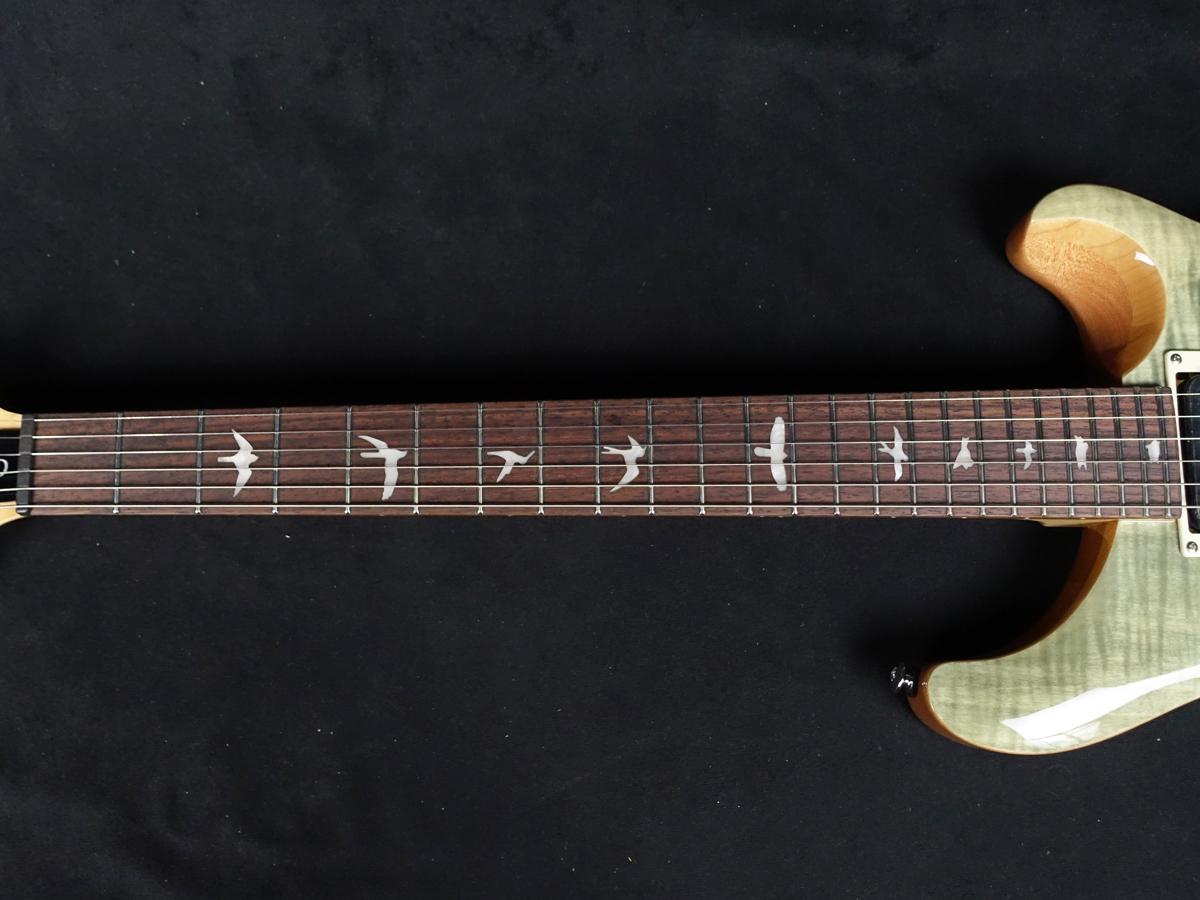 SE Custom 24 Quiltは、マホガニー・バック、メイプル・トップのボディ、Wide Thinカーブのメイプル・ネック、ローズウッド指板、バード・インレイを合わせ、PRSデザインのトレモロ・ブリッジを装備。